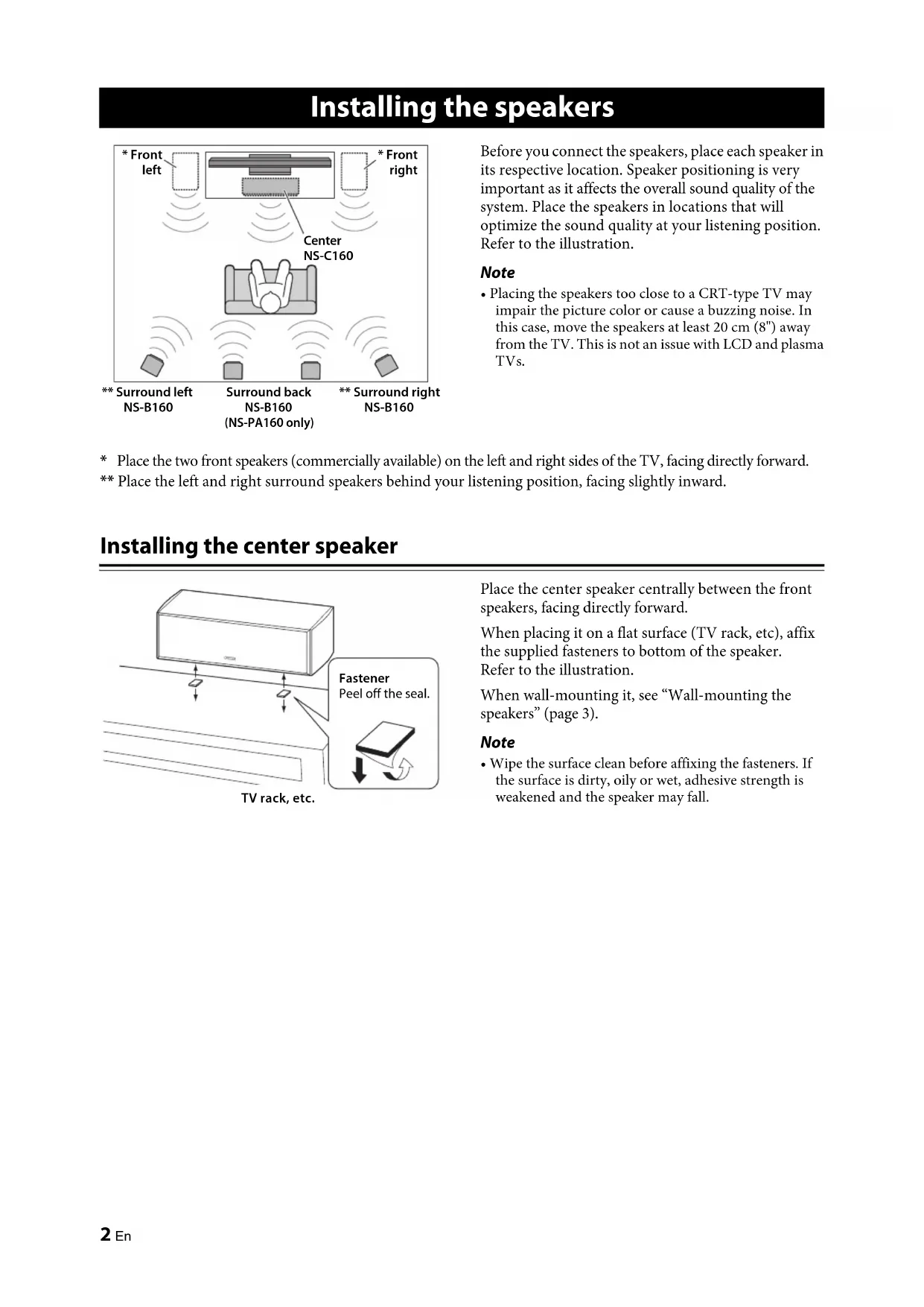 CenterNS-C160* FrontrightSurround back NS-B160 (NS-PA160 only)* Front left ** Surround rightNS-B160** Surround leftNS-B160