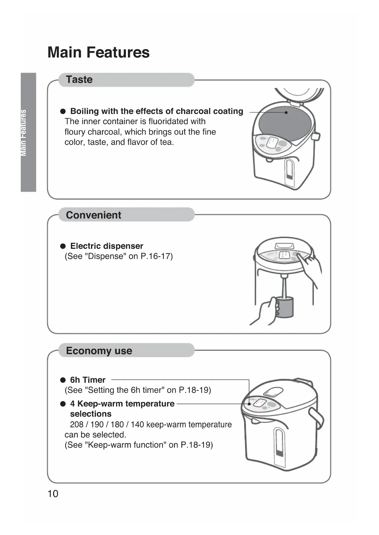 It is ideal to use boiling water for making coffee / tea / instant cup noodles etc. Operating NC-EH40_EN.indd 18 11/7/07 3:57:33 PM19 Convenient use methods Time required for the reboil procedure From 208 keep-warm : approx. 2.5-4 min. From 190 keep-warm : approx. 4-6.5 min. From 180 keep-warm : approx. 6-12 min. From 140 keep-warm : approx. 9-17.5 min. Amount of water: Maximum Room temperature: 68ºF (20ºC) After a short time, water will be kept warm at the settled temperature (The lamp will be lit). 6 hours later, timer will go off and water starts boiling When the water is brought up to boiling temperature, it will be kept warm at 190ºF (90