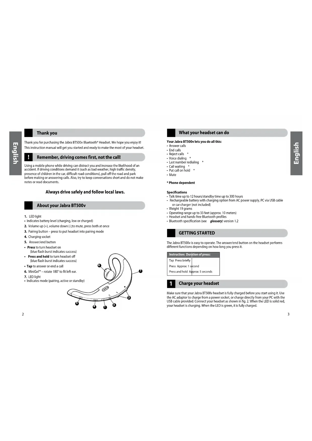 GETTING STARTED The Jabra BT500v is easy to operate. The answer/end button on the headset performs
