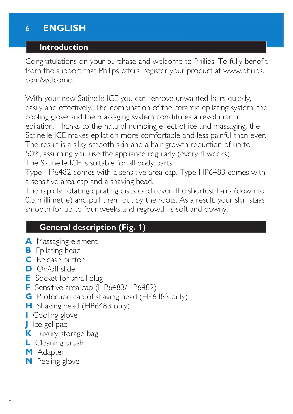 Introduction Congratulations on your purchase and welcome to Philips! To fully benet from the support that Philips offers, register your product at www.philips. com/welcome. With your new Satinelle ICE you can remove unwanted hairs quickly, easily and effectively. The combination of the ceramic epilating system, the cooling glove and the massaging system constitutes a revolution in epilation. Thanks to the natural numbing effect of ice and massaging, the Satinelle ICE makes epilation more comfortable and less painful than ever. The result is a silky-smooth skin and a hair growth reduction of up to 50%, assuming you use the appliance regularly (every 4 weeks). The Satinelle ICE is suitable for all body parts. Type HP6482 comes with a sensitive area cap. Type HP6483 comes with a sensitive area cap and a shaving head. The rapidly rotating epilating discs catch even the shortest hairs (down to