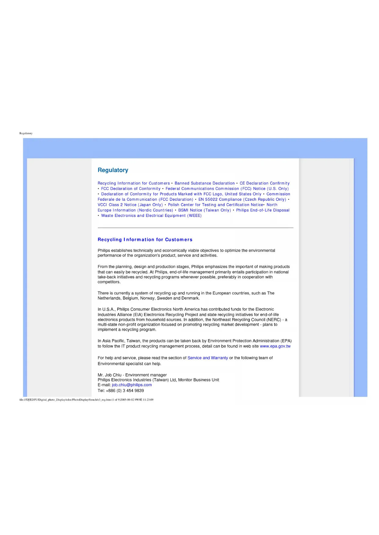 - Waste Electronics and Electrical Equipment (WEEE) Recycling Information for Customers Philips establishes technically and economically viable objectives to optimize the environmental performance of the organization's product, service and activities. From the planning, design and production stages, Philips emphasizes the important of making products that can easily be recycled. At Philips, end-of-life management primarily entails participation in national take-back initiatives and recycling programs whenever possible, preferably in cooperation with competitors. There is currently a system of recycling up and running in the European countries, such as The Netherlands, Belgium, Norway, Sweden and Denmark. In U.S.A., Philips Consumer Electronics North America has contributed funds for the Electronic Industries Alliance (EIA) Electronics Recycling Project and state recycling initiatives for end-of-life electronics products from household sources. In addition, the Northeast Recycling Council (NERC) - a multi-state non-profit organization focused on promoting recycling market development - plans to implement a recycling program. In Asia Pacific, Taiwan, the products can be taken back by Environment Protection Administration (EPA) to follow the IT product recycling management process, detail can be found in web site www.epa.gov.tw For help and service, please read the section of Service and Warranty or the following team of Environmental specialist can help. Mr. Job Chiu - Environment manager Philips Electronics Industries (Taiwan) Ltd, Monitor Business Unit E-mail: job.chiu@philips.com Tel: +886 (0) 3 454 9839 file:///D|/EDFU/Digital_photo_Display/edoc/PhotoDisplay/french/e3_reg.htm (1 of 9)2005-08-02 ¤W¤È 11:23:09Regulatory Mr. Maarten ten Houten - Senior Environmental Consultant Philips Consumer Electronics E-mail: marten.ten.houten@philips.com Tel: +31 (0) 40 27 33402 Ms. Delmer F. Teglas Philips Electronics North America E-mail: butch.teglas@philips.com Tel: +1 865 521 4322