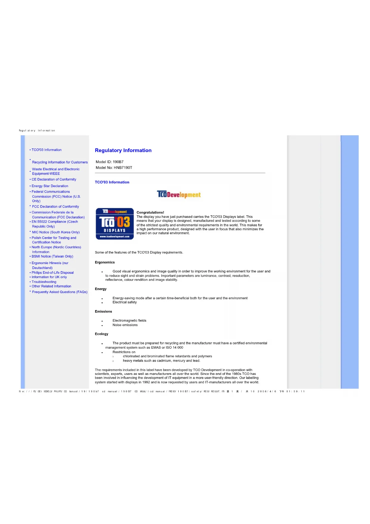 file:///P|/OEM MODELS/PHILIPS/CD Manual/19/190b7 cd manual/190B7 CD MANUAL/lcd/manual/FRENCH/190B7/safety/REGS/REGULAT.HTM 第 1 頁 / 共 10 2006/4/6 下午 01:59:11Regulatory Information
