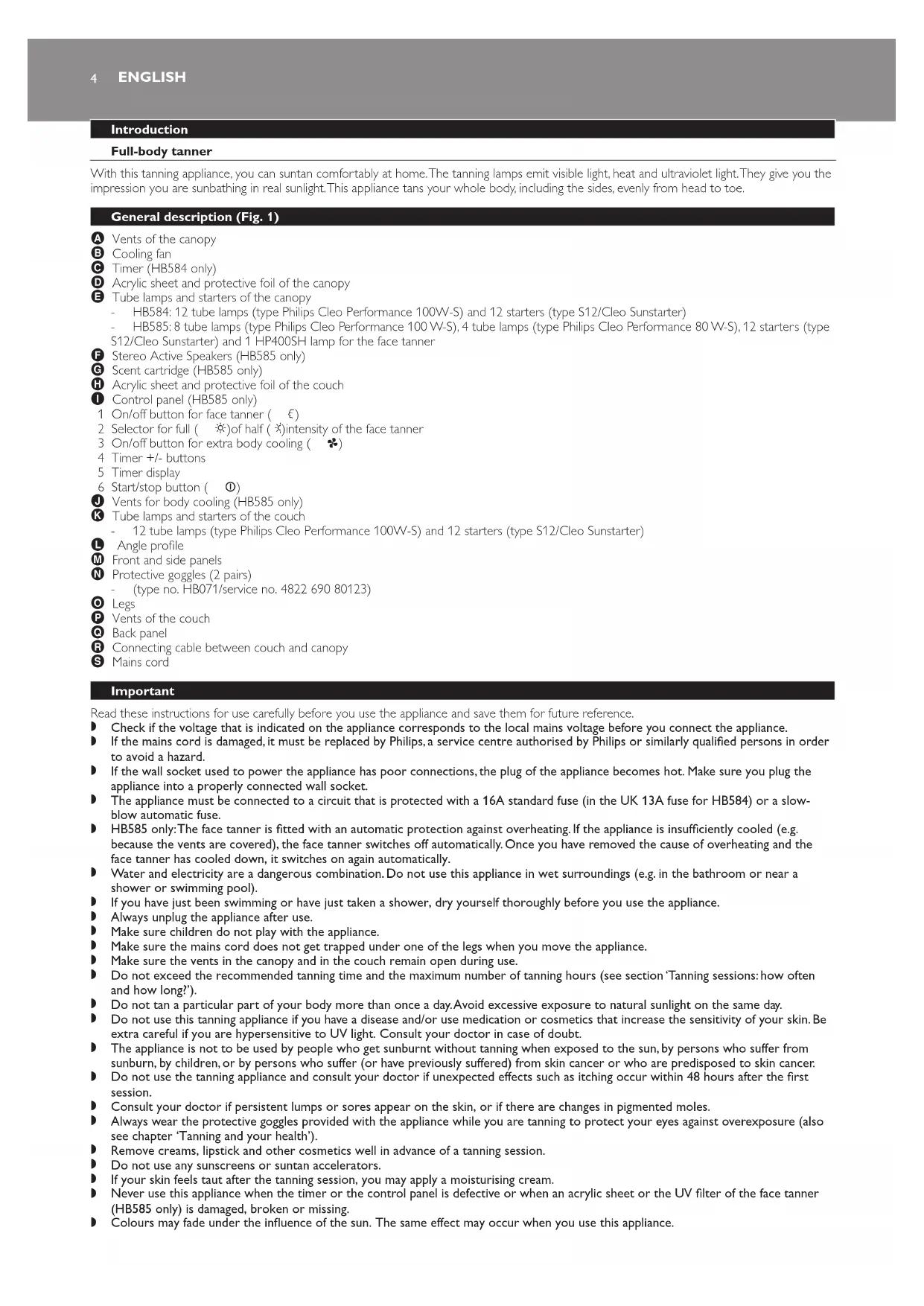 The UV lter of the face tanner (HB585 only) protects against exposure to undesired UV light. It is therefore important to have a