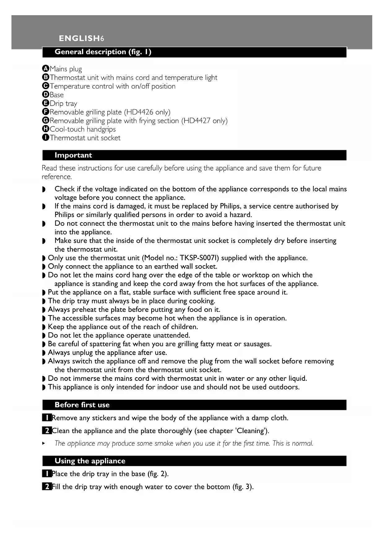 Download the instructions for your Barbecue in PDF format for free! Find your manual HD4426 - PHILIPS and take your electronic device back in hand. On this page are published all the documents necessary for the use of your device. HD4426 by PHILIPS.