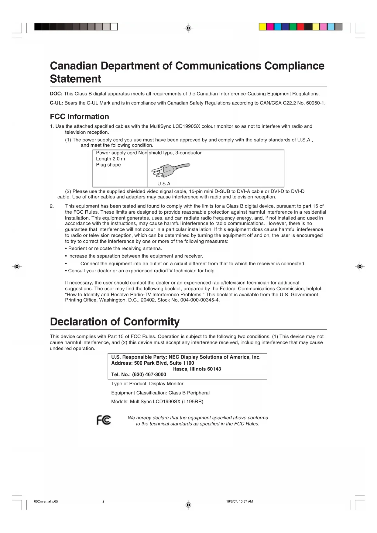 - Consult your dealer or an experienced radio/TV technician for help. If necessary, the user should contact the dealer or an experienced radio/television technician for additional suggestions. The user may find the following booklet, prepared by the Federal Communications Commission, helpful: “How to Identify and Resolve Radio-TV Interference Problems.” This booklet is available from the U.S. Government Printing Office, Washington, D.C., 20402, Stock No. 004-000-00345-4. Declaration of Conformity This device complies with Part 15 of FCC Rules. Operation is subject to the following two conditions. (1) This device may not cause harmful interference, and (2) this device must accept any interference received, including interference that may cause undesired operation. U.S. Responsible Party: NEC Display Solutions of America, Inc. Address: 500 Park Blvd, Suite 1100 Itasca, Illinois 60143 Tel. No.: (630) 467-3000 Type of Product: Display Monitor Equipment Classification: Class B Peripheral Models: MultiSync LCD1990SX (L195RR) We hereby declare that the equipment specified above conforms to the technical standards as specified in the FCC Rules. 00Cover_all.p65 18/6/07, 10:57 AM2TCO’03 Congratulations! The display you have just purchased carries the TCO’03 Displays label. This means that your display is designed, manufactured and tested according to some of the strictest quality and environmental requirements in the world. This makes for a high performance product, designed with the user in focus that also minimizes the impact on our natural environment. Some of the features of the TCO’03 Display requirements: Ergonomics