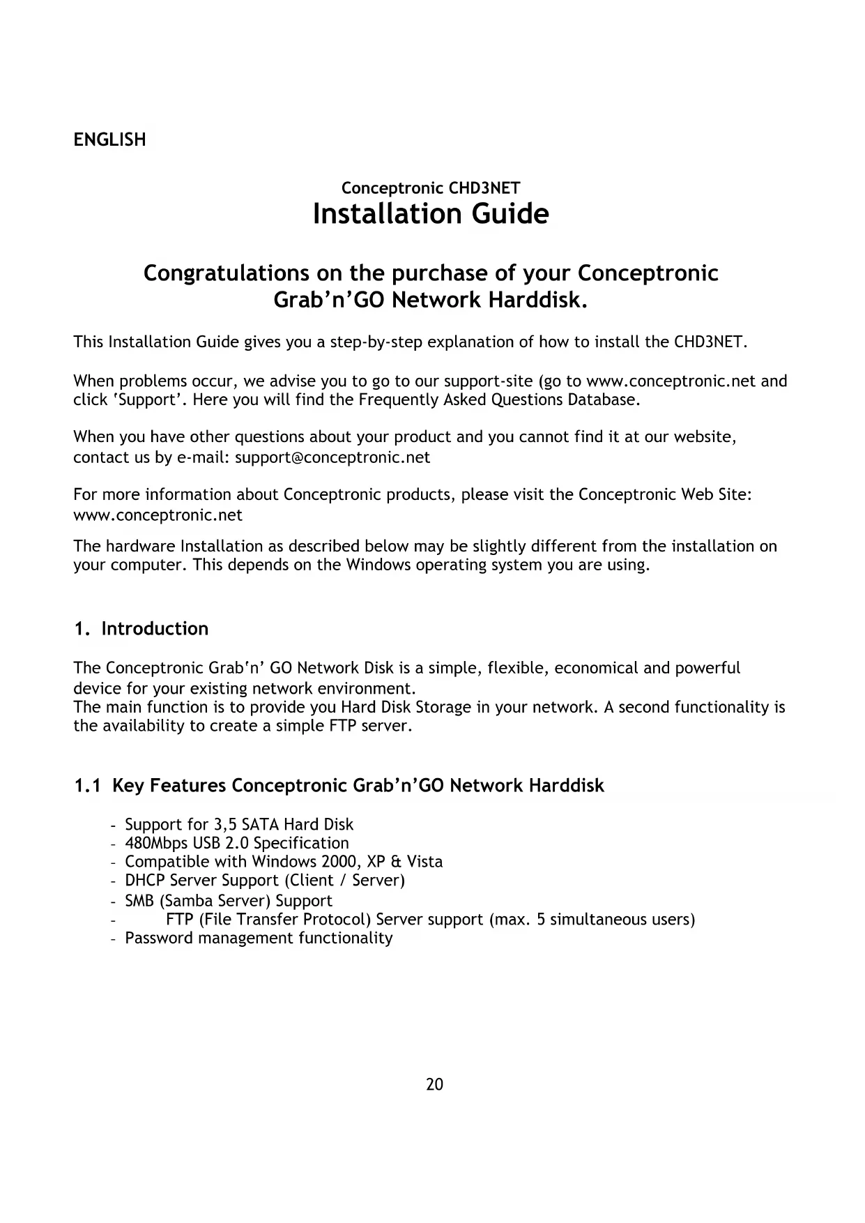 Conceptronic CHD3NET Installation Guide Congratulations on the purchase of your Conceptronic Grab’n’GO Network Harddisk. This Installation Guide gives you a step-by-step explanation of how to install the CHD3NET. When problems occur, we advise you to go to our support-site (go to www.conceptronic.net and click ‘Support’. Here you will find the Frequently Asked Questions Database. When you have other questions about your product and you cannot find it at our website, contact us by e-mail: support@conceptronic.net For more information about Conceptronic products, please visit the Conceptronic Web Site: www.conceptronic.net The hardware Installation as described below may be slightly different from the installation on your computer. This depends on the Windows operating system you are using.