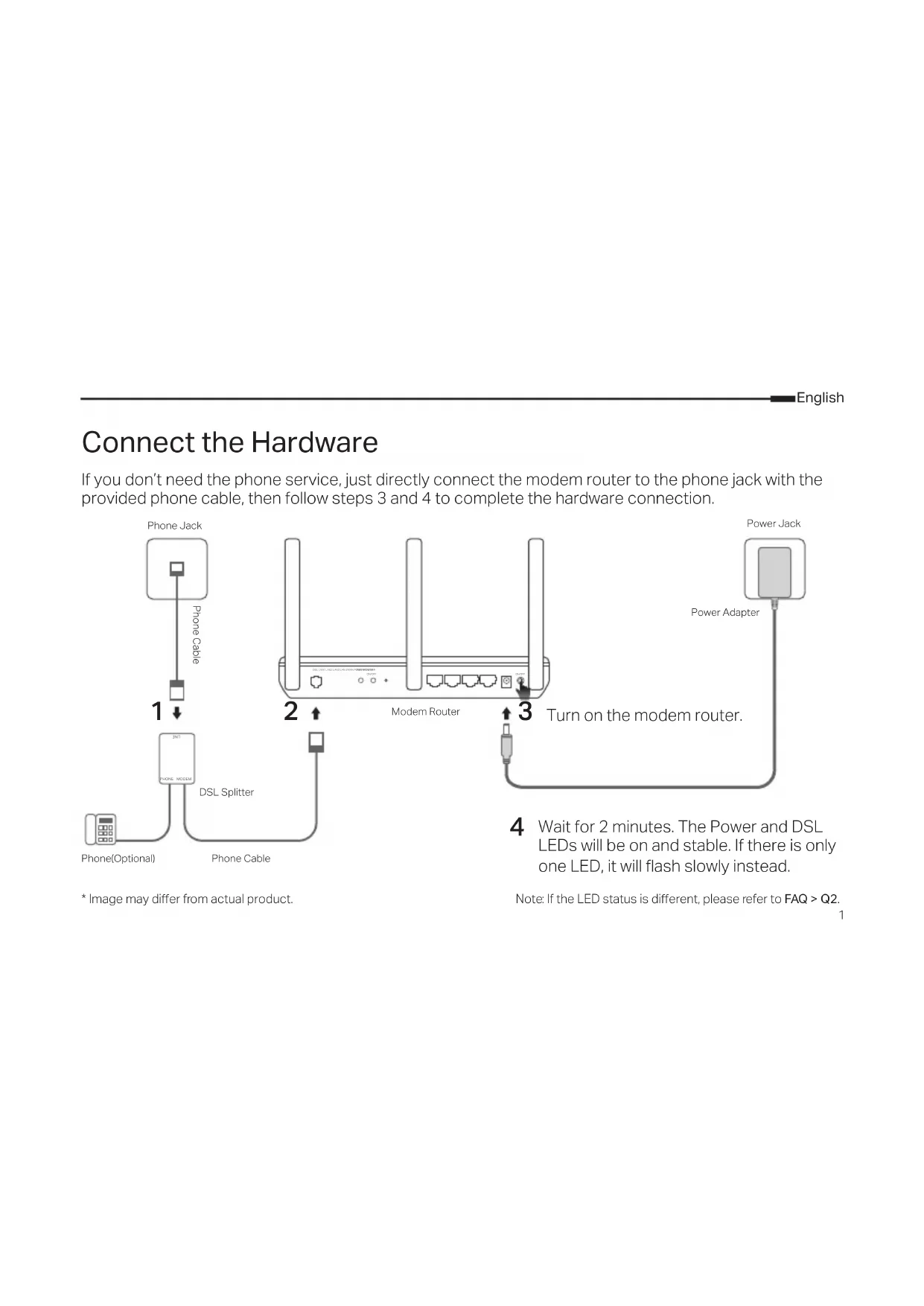 1 2 DSL LAN1 LAN2 LAN3 LAN4/WAN POWER POWERON/OFFWPS RESETWiFiON/OFF * Image may dier from actual product. Note: If the LED status is dierent, please refer to FAQ > Q2.