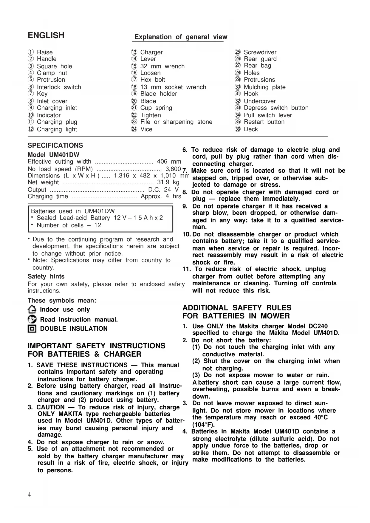 UM401DW - Tondeuse à gazon MAKITA - Free user manual and instructions