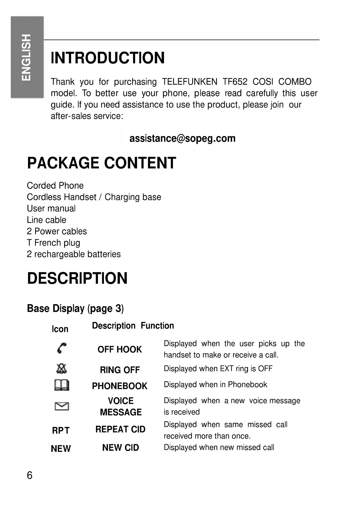 INTRODUCTION Thank you for purchasing TELEFUNKEN TF652 COSI COMBO model. To better use your phone, please read carefully this user guide. If you need assistance to use the product, please join our after-sales service: assistance@sopeg.com PACKAGE CONTENT Corded Phone Cordless Handset / Charging base User manual Line cable 2 Power cables T French plug 2 rechargeable batteries DESCRIPTION Base Display (page 3) Icon Description Function OFF HOOK Displayed when the user picks up the handset to make or receive a call. RING OFF Displayed when EXT ring is OFF PHONEBOOK Displayed when in Phonebook VOICE MESSAGE Displayed when a new voice message is received RPT REPEAT CID Displayed when same missed call received more than once. NEW NEW CID Displayed when new missed call7 ENGLISH