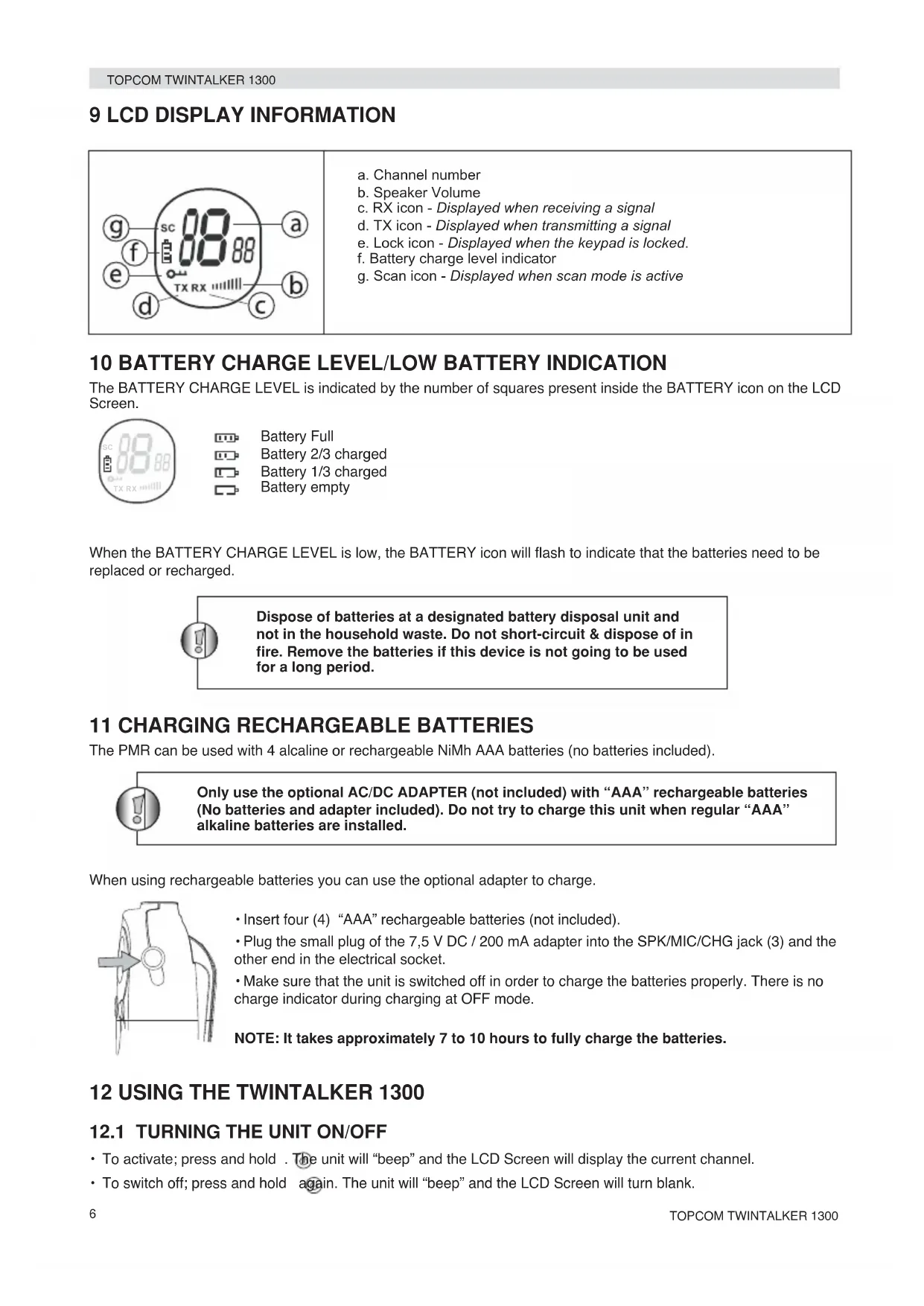 To communicate between PMR devices they need to be set all on the same channel and within receiving range (up to max. 3 km in open field). Since these devices use free frequency bands (channels), all devices in operation share these channels(total 8 channels). Therefore, privacy is not garanteed. Anybody with a PMR set to your channel can overhear the conversation. If you want to communicate (transmitting a voice signal) you need to press the - button (Push to talk). Once this button pressed, the device will go into transmit mode and you can speak into the microphone. All other PMR devices in range , on the same channel and in standby mode (not transmitting) will hear your message. You need to wait until the other party stops transmitting before you can reply to the message. At the end of each transmission the unit will send a beep. To reply, just press the - button and speak into the microphone. PTT PTT If 2 or more users press the - button at the same time the receiver will receive only the stongest signal and the other signal (s) will be supressed. Therefore you should only transmit a signal (press - button) when the channel is free . PTT PTT HL_TT_1300_all.book Page 4 Wednesday, August 25, 2004 10:53 AMTOPCOM TWINTALKER 1300 5 TOPCOM TWINTALKER 1300 ENGLISH 7 GETTING STARTED