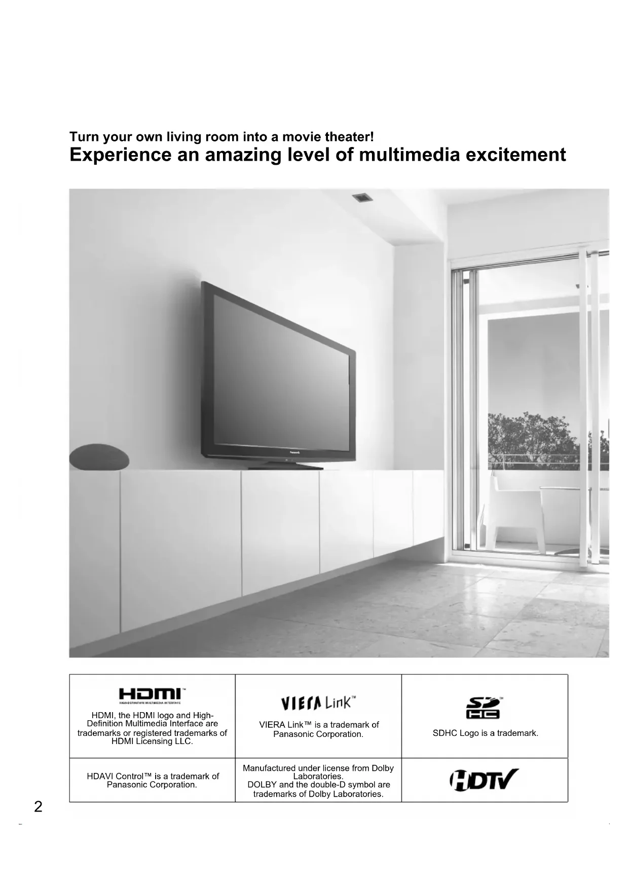 Guide This product qualifies for ENERGY STAR in the “Home” setting and this is the setting in which energy savings will be achieved. Any modifications to the “Home” setting or other factory default settings could result in greater energy consumption beyond levels that meet ENERGY STAR qualifications.iPod is a trademark of Apple Inc., registered in the U.S. and other countries. Watching TV ··············································· 17 Using VIERA TOOLS ································· 19 Viewing from SD Card ·······························20 Watching Videos and DVDs ······················· 22 Displaying PC Screen on TV ····················· 24 Playing an iPod on TV ······························· 25 How to Use Menu Functions (picture, sound quality, etc.) ······················· 28 VIERA Link TM “HDAVI Control TM ” ················ 32 Lock ··························································· 38 Editing and Setting Channels····················· 40 Closed Caption ·········································· 42 Input Labels ··············································· 43 Using Timer ················································ 44 Recommended AV Connections ················ 45 Ratings List for Lock ··································46 Technical Information ································· 47 Care and Cleaning ····································· 51 FAQ ···························································· 52 Specifications ············································· 54 Limited Warranty (for U.S.A. and Puerto Rico only)··············· 55