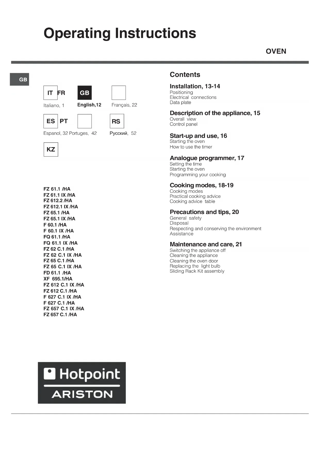 FZ 61.1 IXHA - Oven HOTPOINT ARISTON - Free user manual and instructions