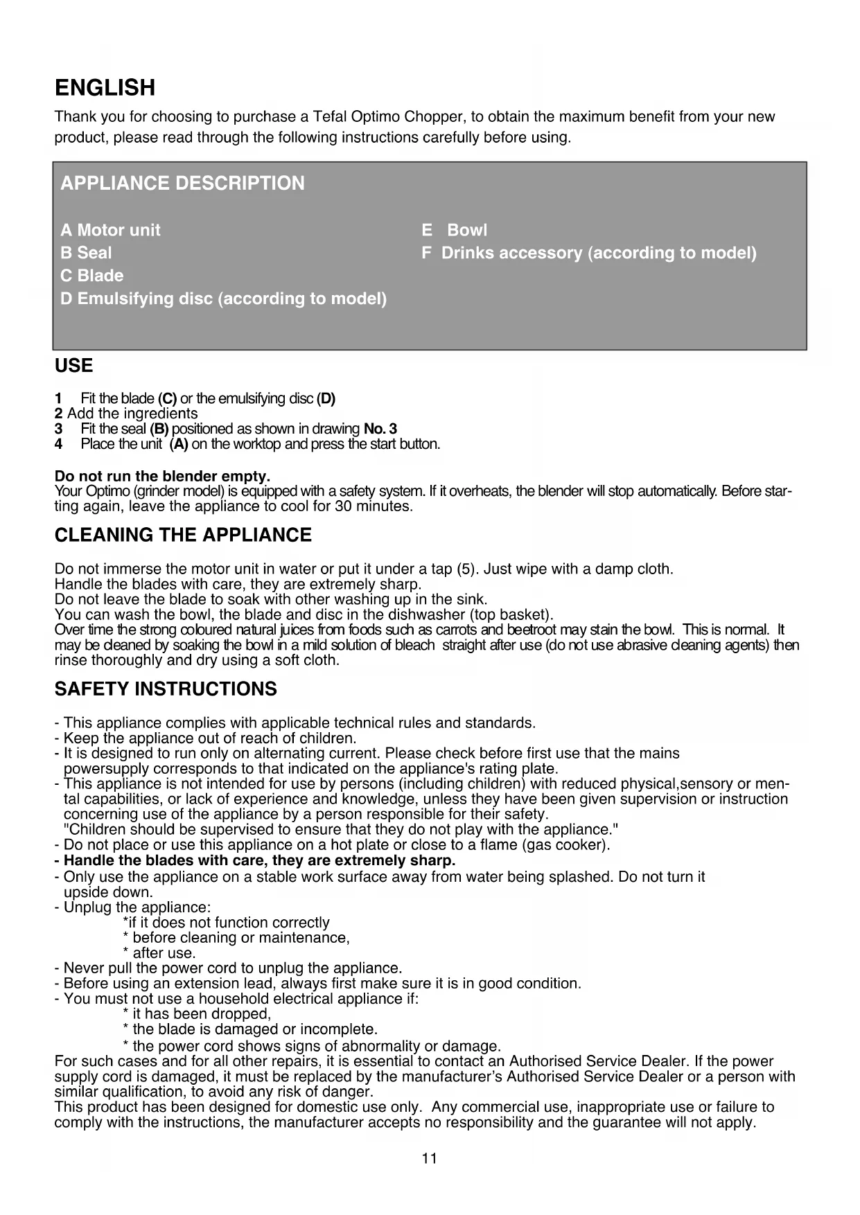 Thank you for choosing to purchase a Tefal Optimo Chopper, to obtain the maximum benefit from your new