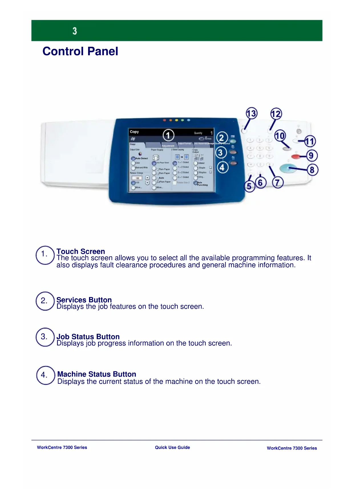 Touch Screen The touch screen allows you to select all the available programming features. It also displays fault clearance procedures and general machine information. Services Button Displays the job features on the touch screen. Job Status Button Displays job progress information on the touch screen.