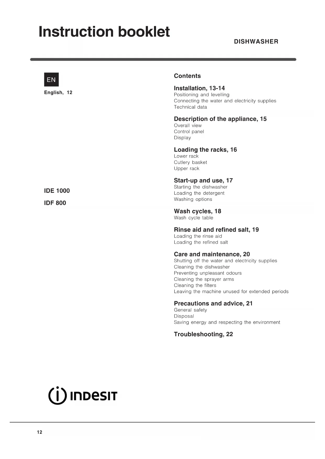 IDF 800 EU.2 - Dishwasher INDESIT - Free user manual and instructions