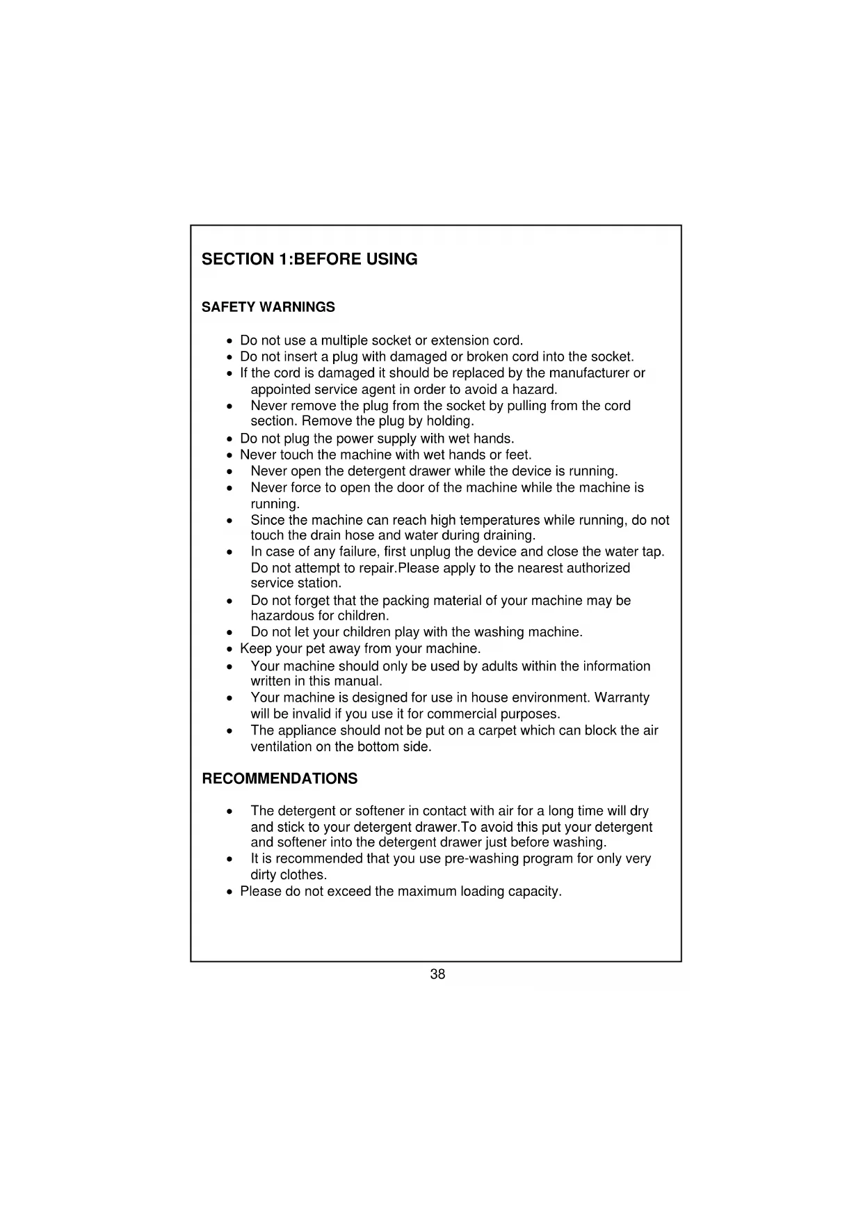 37SECTION 1:BEFORE USING SAFETY WARNINGS