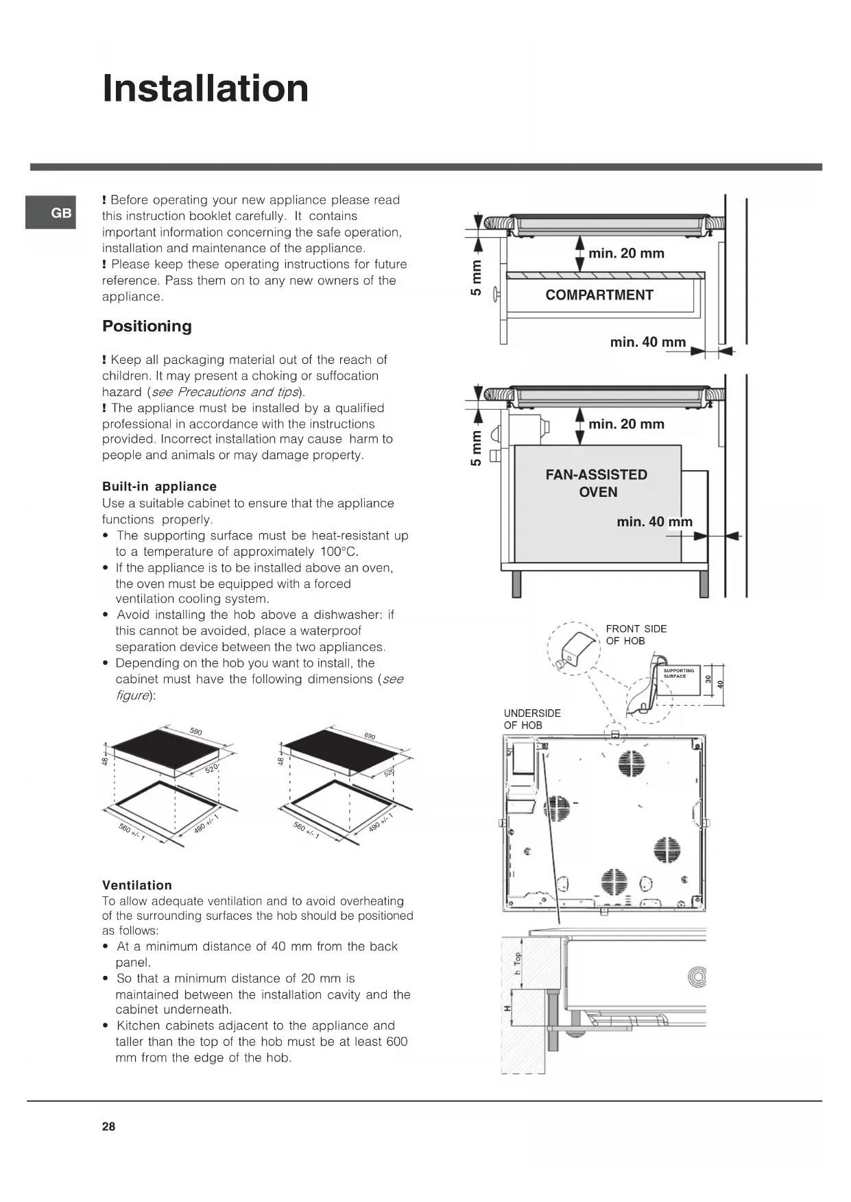 Installation Before operating your new appliance please read this instruction booklet carefully. It contains important information concerning the safe operation, installation and maintenance of the appliance. Please keep these operating instructions for future reference. Pass them on to any new owners of the appliance. Positioning Keep all packaging material out of the reach of children. It may present a choking or suffocation hazard (see Precautions and tips). The appliance must be installed by a qualified professional in accordance with the instructions provided. Incorrect installation may cause harm to people and animals or may damage property. Built-in appliance Use a suitable cabinet to ensure that the appliance functions properly. The supporting surface must be heat-resistant up to a temperature of approximately 100°C. If the appliance is to be installed above an oven, the oven must be equipped with a forced ventilation cooling system. Avoid installing the hob above a dishwasher: if this cannot be avoided, place a waterproof separation device between the two appliances. Depending on the hob you want to install, the cabinet must have the following dimensions (see figure): Ventilation To allow adequate ventilation and to avoid overheating of the surrounding surfaces the hob should be positioned as follows: At a minimum distance of 40 mm from the back panel. So that a minimum distance of 20 mm is maintained between the installation cavity and the cabinet underneath. Kitchen cabinets adjacent to the appliance and taller than the top of the hob must be at least 600 mm from the edge of the hob.
