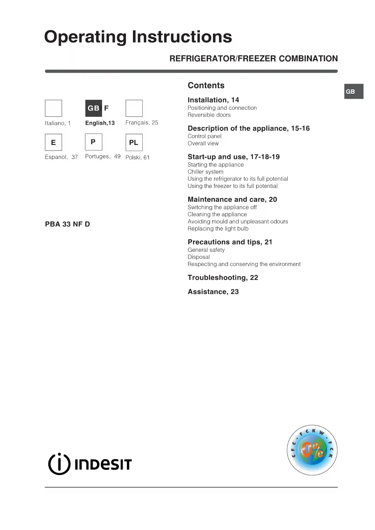 Download the instructions for your Fridge in PDF format for free! Find your manual Combinado PBAA 33 NF D - INDESIT and take your electronic device back in hand. On this page are published all the documents necessary for the use of your device. Combinado PBAA 33 NF D by INDESIT.