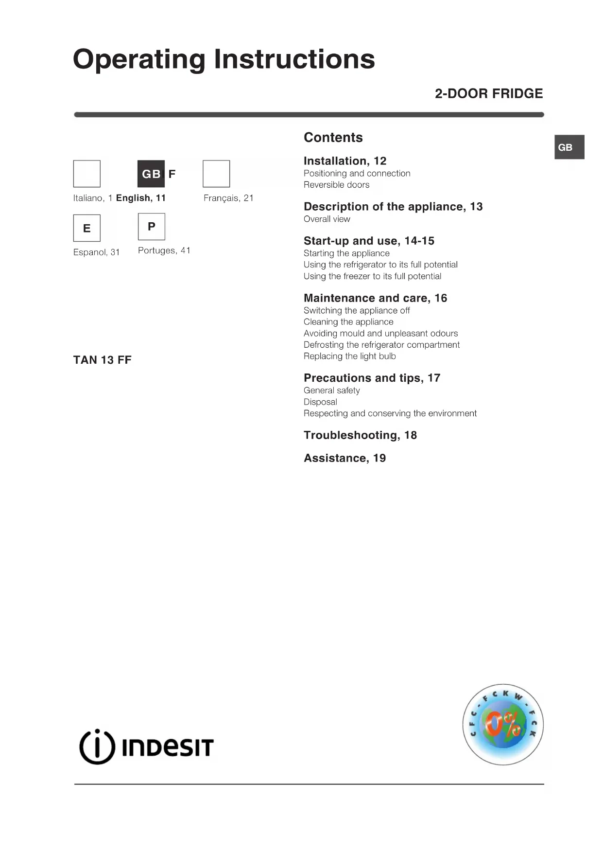 Download the instructions for your Fridge in PDF format for free! Find your manual Doble puerta TAN 13 FF - INDESIT and take your electronic device back in hand. On this page are published all the documents necessary for the use of your device. Doble puerta TAN 13 FF by INDESIT.