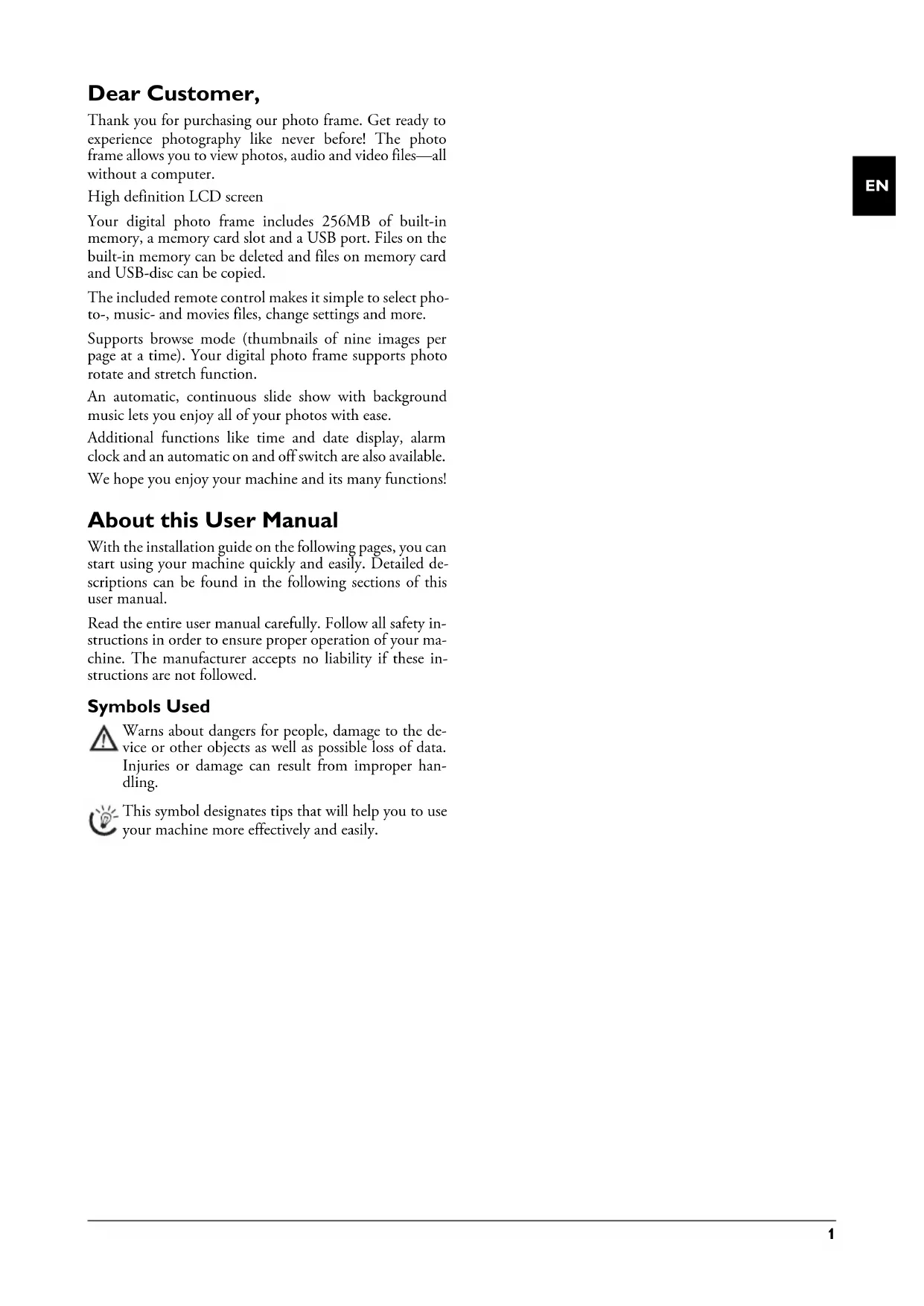 Dear Customer, Thank you for purchasing our photo frame. Get ready to experience photography like never before! The photo frame allows you to view photos, audio and video files—all without a computer. High definition LCD screen Memory Your digital photo frame includes 256MB of built-in memory, a memory card slot and a USB port. Files on the built-in memory can be deleted and files on memory card and USB-disc can be copied. The included remote control makes it simple to select pho- to-, music- and movies files, change settings and more. Supports browse mode (thumbnails of nine images per page at a time). Your digital photo frame supports photo rotate and stretch function. An automatic, continuous slide show with background music lets you enjoy all of your photos with ease. Additional functions like time and date display, alarm clock and an automatic on and off switch are also available. We hope you enjoy your machine and its many functions! About this User Manual With the installation guide on the following pages, you can start using your machine quickly and easily. Detailed de- scriptions can be found in the following sections of this user manual. Read the entire user manual carefully. Follow all safety in- structions in order to ensure proper operation of your ma- chine. The manufacturer accepts no liability if these in- structions are not followed. Symbols Used Dangers Tips Warns about dangers for people, damage to the de- vice or other objects as well as possible loss of data. Injuries or damage can result from improper han- dling. This symbol designates tips that will help you to use your machine more effectively and easily. af-5086_5105_5135ms_manual_en_253145915-a.book Seite 1 Montag, 15. September 2008 9:47 092 AgfaPhoto Digital Photo Frame AF 5086MS · AF 5105MS · AF 5135MS