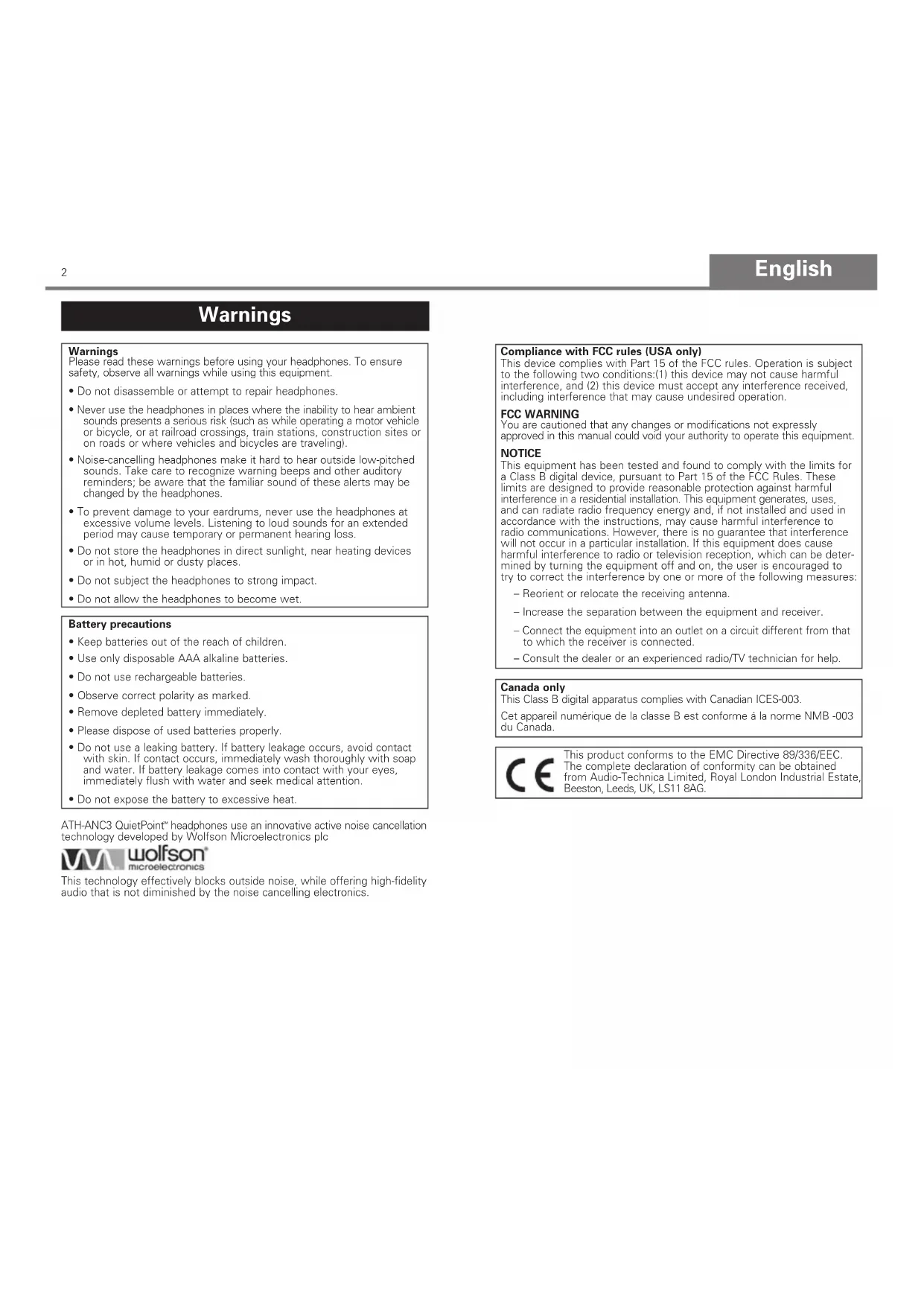 - Do not expose the battery to excessive heat. This product conforms to the EMC Directive 89/336/EEC. The complete declaration of conformity can be obtained from Audio-Technica Limited, Royal London Industrial Estate, Beeston, Leeds, UK, LS11 8AG. Compliance with FCC rules (USA only) This device complies with Part 15 of the FCC rules. Operation is subject to the following two conditions:(1) this device may not cause harmful interference, and (2) this device must accept any interference received, including interference that may cause undesired operation. FCC WARNING You are cautioned that any changes or modifications not expressly approved in this manual could void your authority to operate this equipment. NOTICE This equipment has been tested and found to comply with the limits for a Class B digital device, pursuant to Part 15 of the FCC Rules. These limits are designed to provide reasonable protection against harmful interference in a residential installation. This equipment generates, uses, and can radiate radio frequency energy and, if not installed and used in accordance with the instructions, may cause harmful interference to radio communications. However, there is no guarantee that interference will not occur in a particular installation. If this equipment does cause harmful interference to radio or television reception, which can be deter- mined by turning the equipment off and on, the user is encouraged to try to correct the interference by one or more of the following measures: – Reorient or relocate the receiving antenna. – Increase the separation between the equipment and receiver. – Connect the equipment into an outlet on a circuit different from that to which the receiver is connected. – Consult the dealer or an experienced radio/TV technician for help. Canada only This Class B digital apparatus complies with Canadian ICES-003. Cet appareil numérique de la classe B est conforme á la norme NMB -003 du Canada. ATH-ANC3 QuietPoint