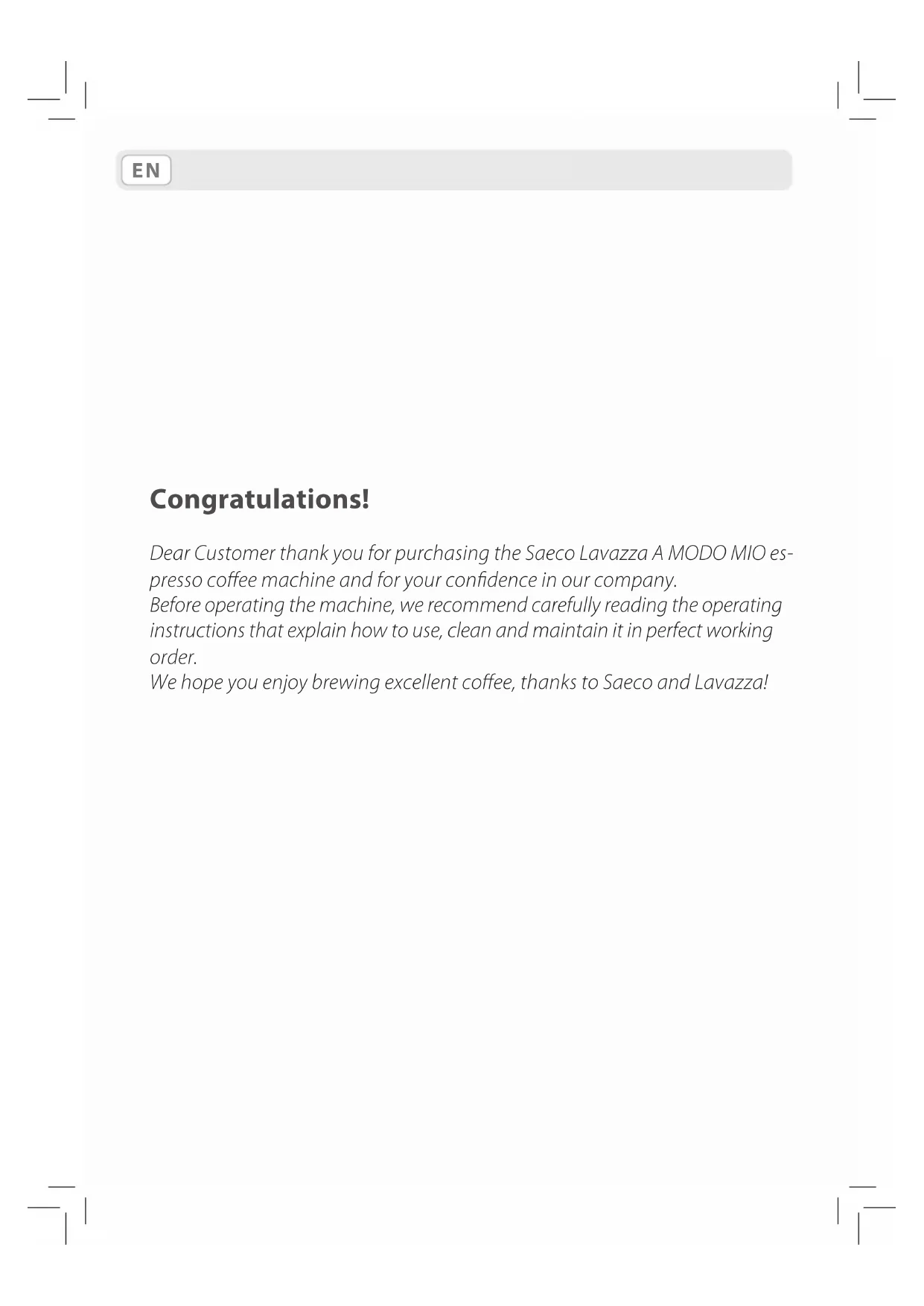 Dear Customer thank you for purchasing the Saeco Lavazza A MODO MIO es-