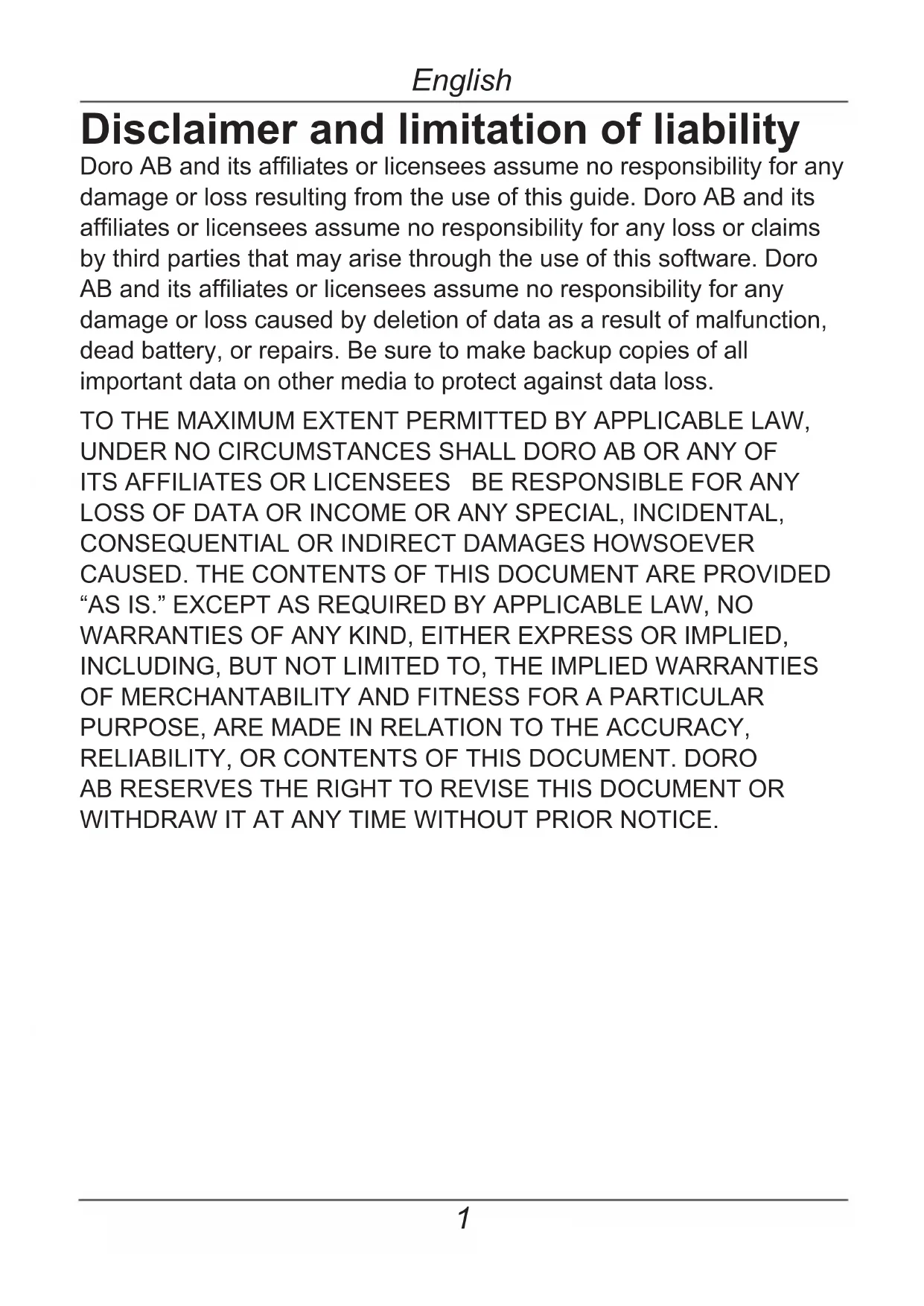 y Configuración de señal de llamada/vibrador 7 Tecla de desconexión (encendido/apagado) 8 Teclas de marcación directa 9 Conector de carga/ auriculares1 English Disclaimer and limitation of liability Doro AB and its affiliates or licensees assume no responsibility for any damage or loss resulting from the use of this guide. Doro AB and its affiliates or licensees assume no responsibility for any loss or claims by third parties that may arise through the use of this software. Doro AB and its affiliates or licensees assume no responsibility for any damage or loss caused by deletion of data as a result of malfunction, dead battery, or repairs. Be sure to make backup copies of all important data on other media to protect against data loss. TO THE MAXIMUM EXTENT PERMITTED BY APPLICABLE LAW, UNDER NO CIRCUMSTANCES SHALL DORO AB OR ANY OF ITS AFFILIATES OR LICENSEES BE RESPONSIBLE FOR ANY LOSS OF DATA OR INCOME OR ANY SPECIAL, INCIDENTAL,