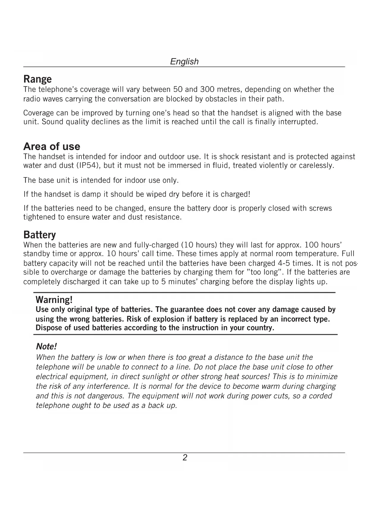 - Guarantee English Range The telephone’s coverage will vary between 50 and 300 metres, depending on whether the radio waves carrying the conversation are blocked by obstacles in their path. Coverage can be improved by turning one’s head so that the handset is aligned with the base unit. Sound quality declines as the limit is reached until the call is nally interrupted. Area of use The handset is intended for indoor and outdoor use. It is shock resistant and is protected against water and dust (IP54), but it must not be immersed in uid, treated violently or carelessly. The base unit is intended for indoor use only. If the handset is damp it should be wiped dry before it is charged! If the batteries need to be changed, ensure the battery door is properly closed with screws tightened to ensure water and dust resistance. Battery When the batteries are new and fully-charged (10 hours) they will last for approx. 100 hours’ standby time or approx. 10 hours’ call time. These times apply at normal room temperature. Full battery capacity will not be reached until the batteries have been charged 4-5 times. It is not pos- sible to overcharge or damage the batteries by charging them for ”too long”. If the batteries are completely discharged it can take up to 5 minutes’ charging before the display lights up. Warning! Use only original type of batteries The guarantee does not cover any damage caused by using the wrong batteries Risk of explosion if battery is replaced by an incorrect type Dispose of used batteries according to the instruction in your country Note! When the battery is low or when there is too great a distance to the base unit the telephone will be unable to connect to a line. Do not place the base unit close to other electrical equipment, in direct sunlight or other strong heat sources! This is to minimize the risk of any interference. It is normal for the device to become warm during charging and this is not dangerous. The equipment will not work during power cuts, so a corded telephone ought to be used as a back up.3 English Base unit indicators p. 122