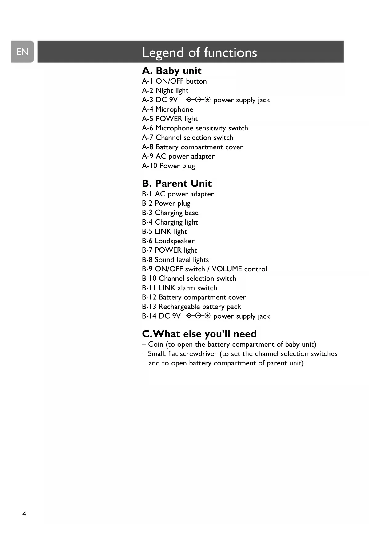 – Coin (to open the battery compartment of baby unit)