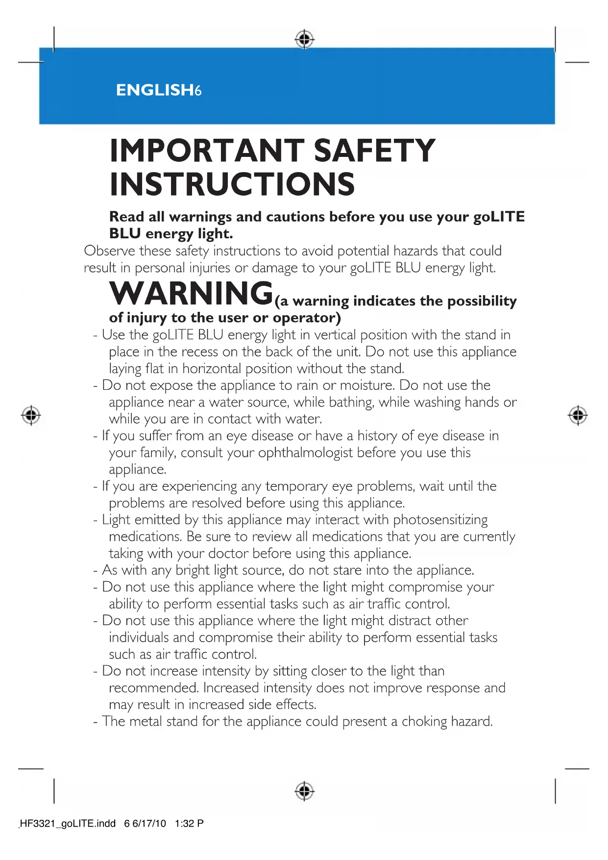 IMPORTANT SAFETY INSTRUCTIONS Read all warnings and cautions before you use your goLITE BLU energy light.