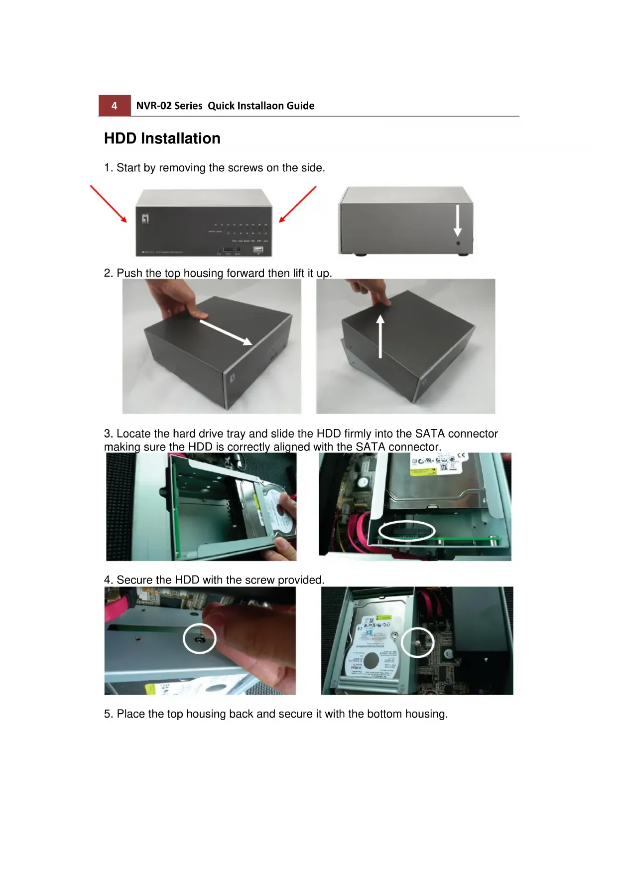 5. Place the top housing back and secure it with the bottom housing.NVR-02 Series Quick Installation Guide