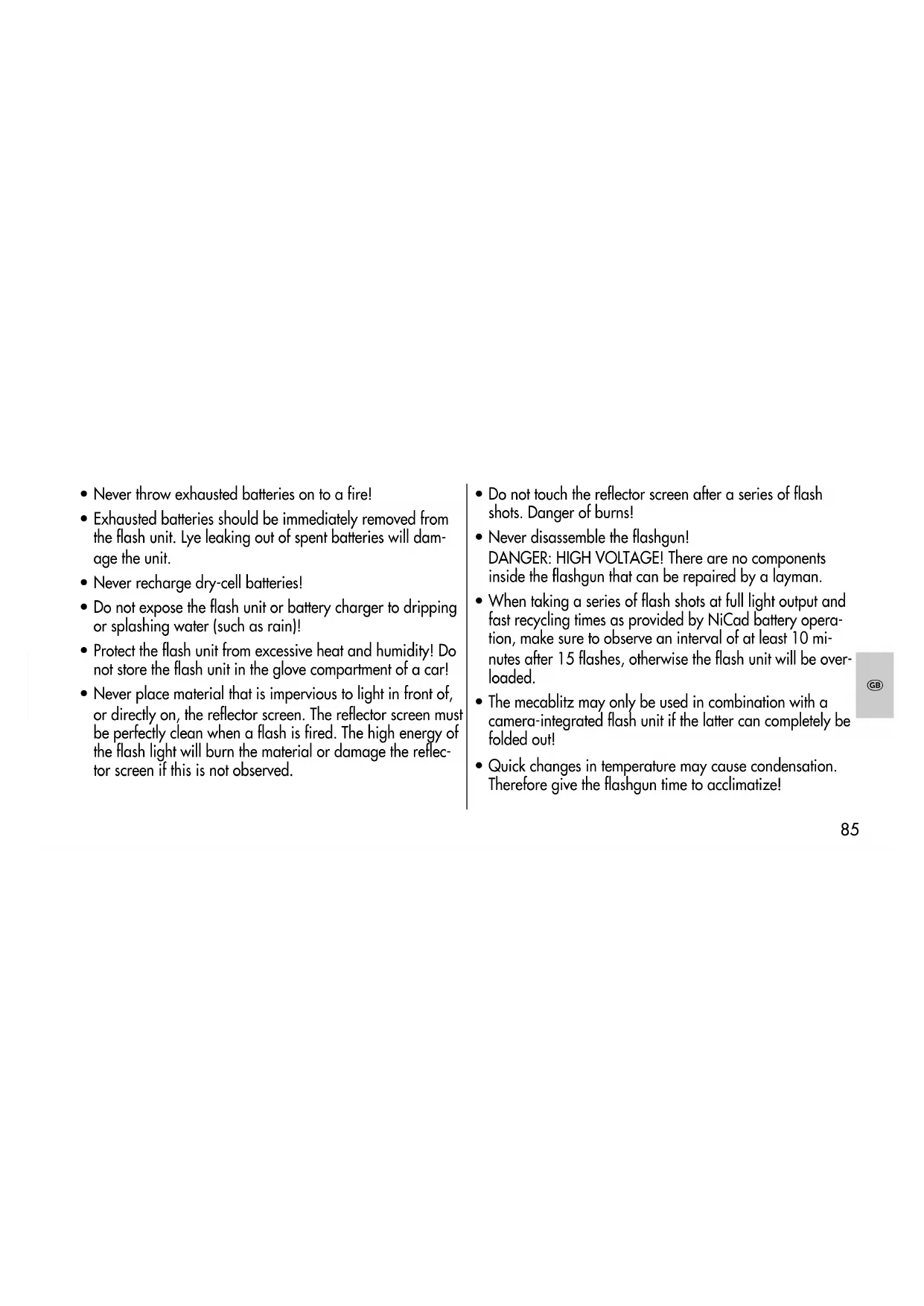 When taking a series of flash shots at full light output and fast recycling times as provided by NiCad battery opera- tion, make sure to observe an interval of at least 10 mi- nutes after 15 flashes, otherwise the flash unit will be over- loaded.