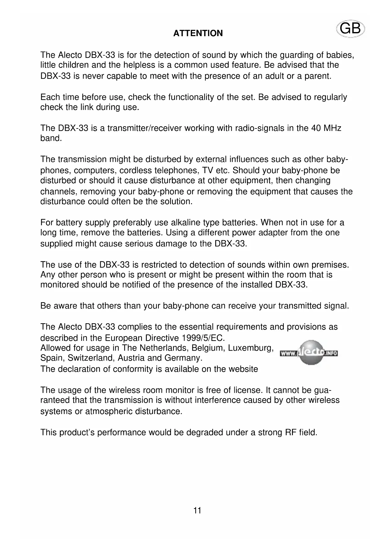DBX33 - Baby monitors ALECTO - Free user manual and instructions