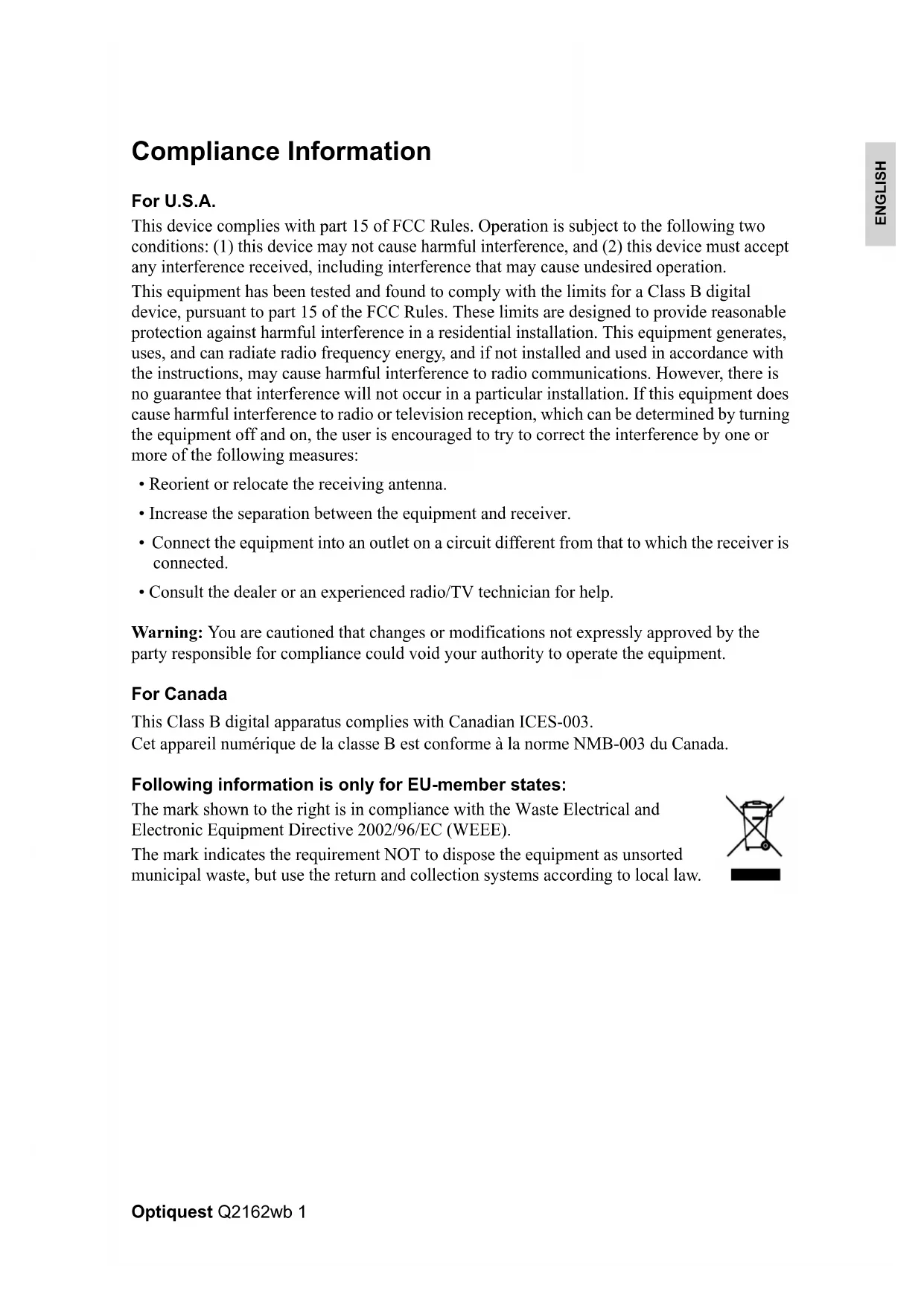 party responsible for compliance could void your authority to operate the equipment. For Canada This Class B digital apparatus complies with Canadian ICES-003. Cet appareil numérique de la classe B est conforme à la norme NMB-003 du Canada. Following information is only for EU-member states: The mark shown to the right is in compliance with the Waste Electrical and Electronic Equipment Directive 2002/96/EC (WEEE). The mark indicates the requirement NOT to dispose the equipment as unsorted municipal waste, but use the return and collection systems according to local law.2 Optiquest Q2162wb ENGLISH Important Safety Instructions