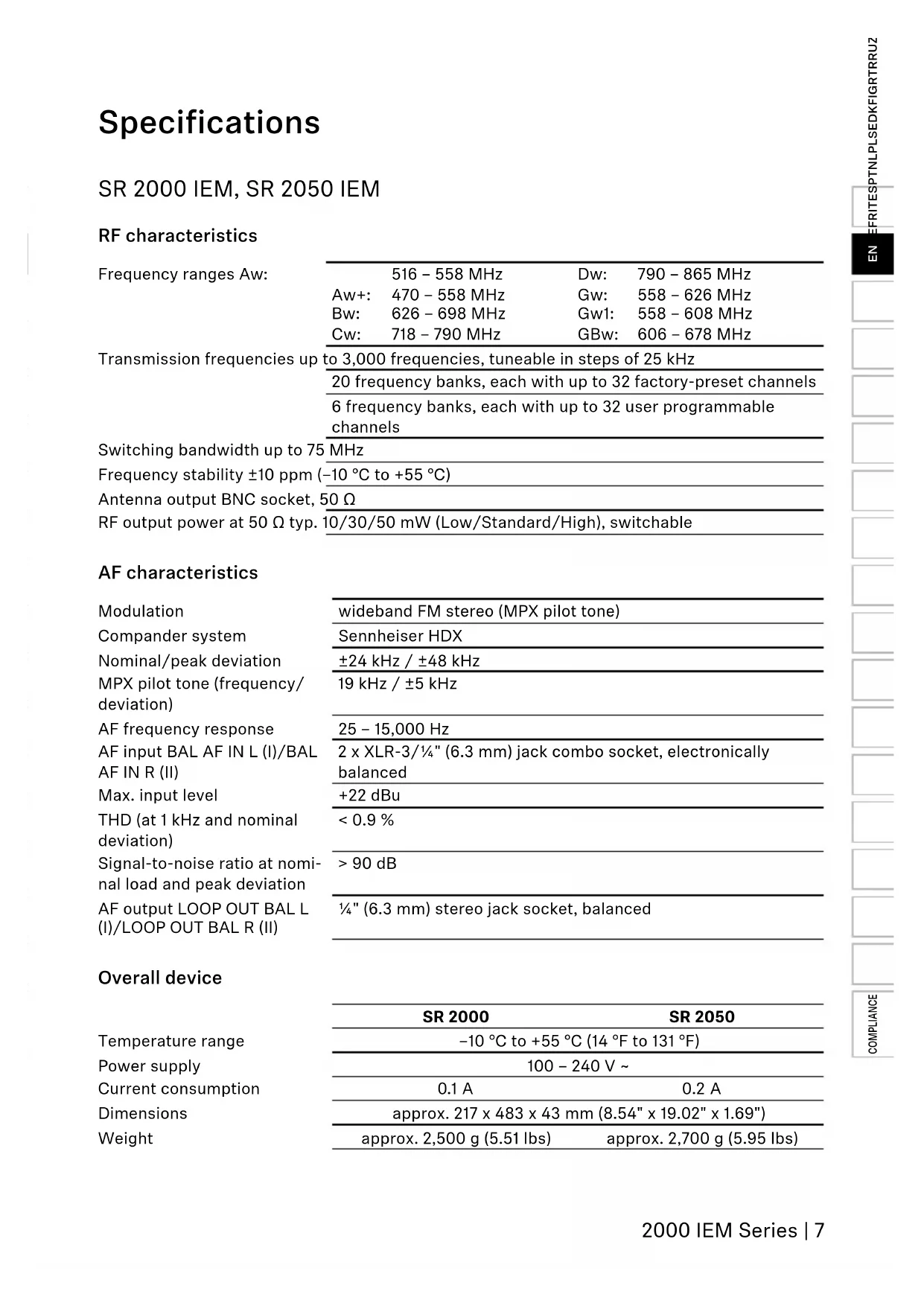RF characteristics Frequency ranges Aw: Aw+: Bw: Cw: 516 – 558 MHz 470 – 558 MHz 626 – 698 MHz 718 – 790 MHz Dw: Gw: Gw1: GBw: 790 – 865 MHz 558 – 626 MHz 558 – 608 MHz 606 – 678 MHz Transmission frequencies up to 3,000 frequencies, tuneable in steps of 25 kHz 20 frequency banks, each with up to 32 factory-preset channels 6 frequency banks, each with up to 32 user programmable channels Switching bandwidth up to 75 MHz Frequency stability ±10 ppm (–10 °C to +55 °C) Antenna output BNC socket, 50 Ω RF output power at 50 Ω typ. 10/30/50 mW (Low/Standard/High), switchable AF characteristics Modulation wideband FM stereo (MPX pilot tone) Compander system Sennheiser HDX Nominal/peak deviation ±24 kHz / ±48 kHz MPX pilot tone (frequency/ deviation) 19 kHz / ±5 kHz AF frequency response 25 – 15,000 Hz AF input BAL AF IN L (I)/BAL AF IN R (II) 2 x XLR-3/¼" (6.3 mm) jack combo socket, electronically balanced Max. input level +22 dBu THD (at 1 kHz and nominal deviation) < 0.9 % Signal-to-noise ratio at nomi- nal load and peak deviation > 90 dB AF output LOOP OUT BAL L (I)/LOOP OUT BAL R (II) ¼" (6.3 mm) stereo jack socket, balanced Overall device SR 2000 SR 2050 Temperature range –10 °C to +55 °C (14 °F to 131 °F) Power supply 100 – 240 V ~ Current consumption 0.1 A 0.2 A Dimensions approx. 217 x 483 x 43 mm (8.54" x 19.02" x 1.69") Weight approx. 2,500 g (5.51 lbs) approx. 2,700 g (5.95 lbs)8 | 2000 IEM Series Connector assignment Audio ¼" (6.3 mm) stereo jack plug, balanced (Audio In/Loop out) XLR-3F connector, balanced (Audio In)