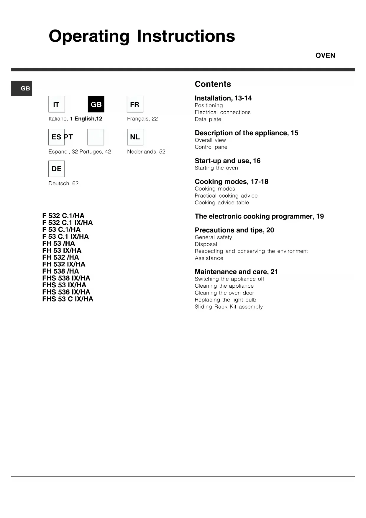 USER MANUAL F 532 C.1 IX HA HOTPOINT ARISTON