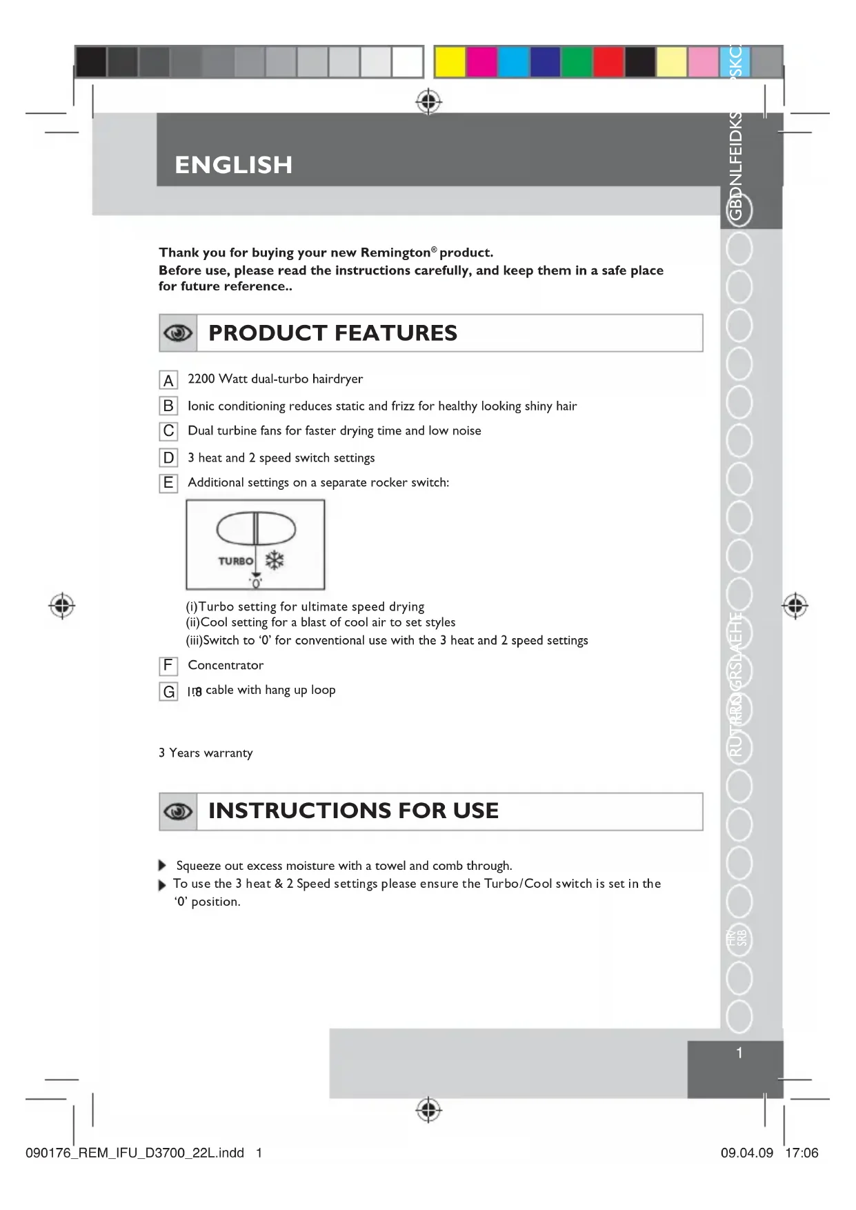 Squeeze out excess moisture with a towel and comb through. To use the 3 heat & 2 Speed settings please ensure the Turbo/Cool switch is set in the ‘0’ position. B5(0B,)8B'B/LQGG 3 Years warrantyENGLISH