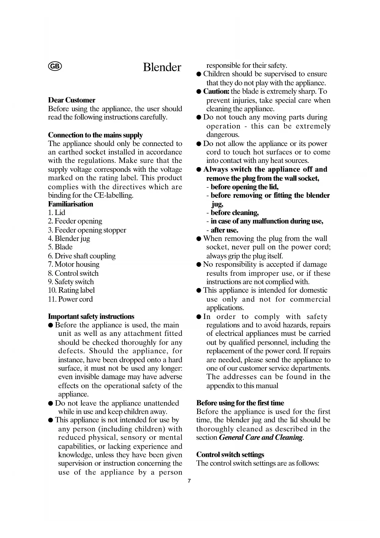 Important safety instructions ● Before the appliance is used, the main unit as well as any attachment fitted should be checked thoroughly for any defects. Should the appliance, for instance, have been dropped onto a hard surface, it must not be used any longer: even invisible damage may have adverse effects on the operational safety of the appliance. ● Do not leave the appliance unattended while in use and keep children away. ● This appliance is not intended for use by any person (including children) with reduced physical, sensory or mental capabilities, or lacking experience and knowledge, unless they have been given supervision or instruction concerning the use of the appliance by a person responsible for their safety. ● Children should be supervised to ensure that they do not play with the appliance. ● Caution: the blade is extremely sharp. To prevent injuries, take special care when cleaning the appliance. ● Do not touch any moving parts during operation - this can be extremely dangerous. ● Do not allow the appliance or its power cord to touch hot surfaces or to come into contact with any heat sources. ● Always switch the appliance off and remove the plug from the wall socket, - before opening the lid, - before removing or fitting the blender jug, - before cleaning, - in case of any malfunction during use, - after use. ● When removing the plug from the wall socket, never pull on the power cord; always grip the plug itself. ● No responsibility is accepted if damage results from improper use, or if these instructions are not complied with. ● This appliance is intended for domestic use only and not for commercial applications. ● In order to comply with safety regulations and to avoid hazards, repairs of electrical appliances must be carried out by qualified personnel, including the replacement of the power cord. If repairs are needed, please send the appliance to one of our customer service departments. The addresses can be found in the appendix to this manual Before using for the first time Before the appliance is used for the first time, the blender jug and the lid should be thoroughly cleaned as described in the section General Care and Cleaning. Control switch settings The control switch settings are as follows: