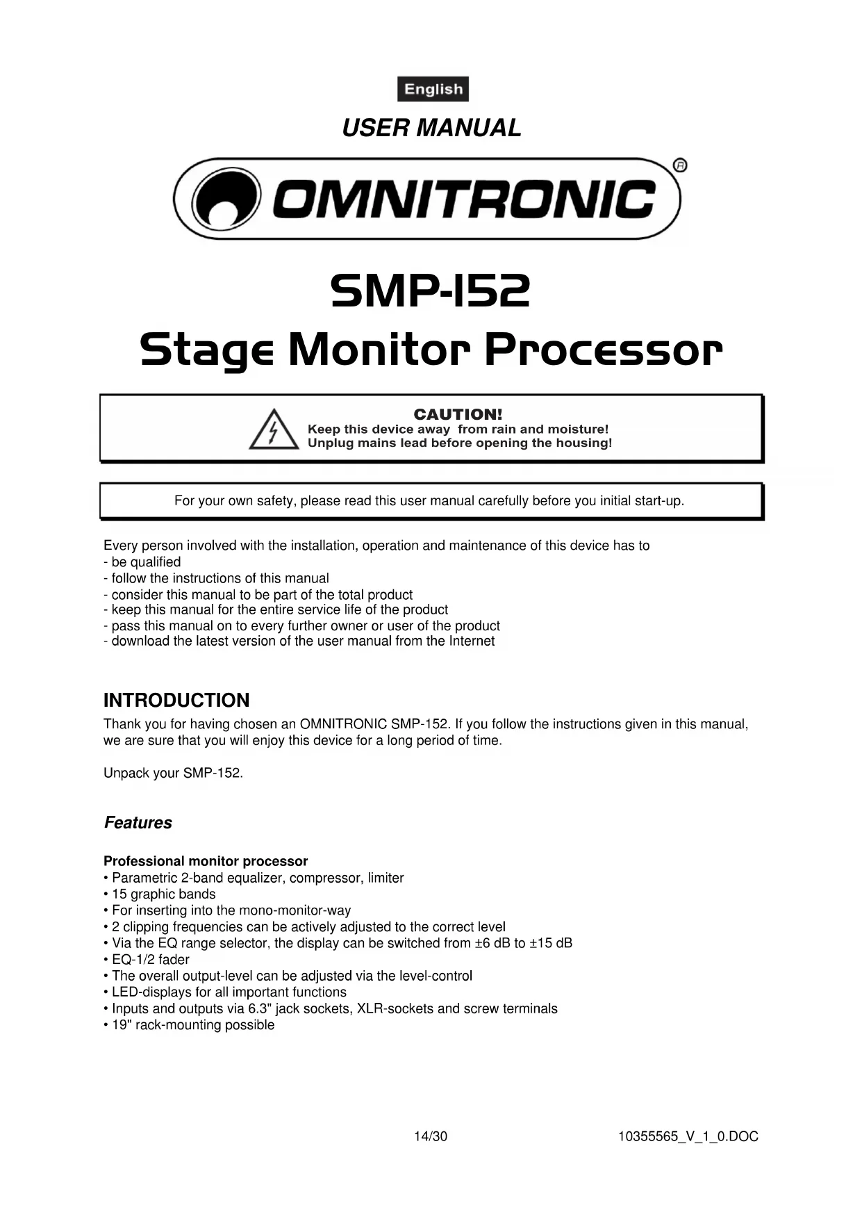 USER MANUAL SMP-152 Stage Monitor Processor CAUTION! Keepthisdeviceawayfromrainandmoisture!Unplugmainsleadbeforeopeningthehousing!For your own safety, please read this user manual carefully before you initial start-up.Every person involved with the installation, operation and maintenance of this device has to- be qualified- follow the instructions of this manual- consider this manual to be part of the total product- keep this manual for the entire service life of the product- pass this manual on to every further owner or user of the product- download the latest version of the user manual from the Internet INTRODUCTION Thank you for having chosen an OMNITRONIC SMP-152. If you follow the instructions given in this manual,we are sure that you will enjoy this device for a long period of time.Unpack your SMP-152. Features Professional monitor processor• Parametric 2-band equalizer, compressor, limiter• 15 graphic bands• For inserting into the mono-monitor-way• 2 clipping frequencies can be actively adjusted to the correct level• Via the EQ range selector, the display can be switched from ±6 dB to ±15 dB• EQ-1/2 fader• The overall output-level can be adjusted via the level-control• LED-displays for all important functions• Inputs and outputs via 6.3" jack sockets, XLR-sockets and screw terminals• 19" rack-mounting possible10355565_V_1_0.DOC 15/30 SAFETY INSTRUCTIONS CAUTION! Becarefulwithyouroperations.Withadangerousvoltageyoucansufferadangerous electricshockwhentouchingthewires! This device has left our premises in absolutely perfect condition. In order to maintain this condition and to ensure a safe operation, it is absolutely necessary for the user to follow the safety instructions and warning notes written in this user manual. Important: Damages caused by the disregard of this user manual are not subject to warranty. The dealer will not accept liability for any resulting defects or problems. If the device has been exposed to drastic temperature fluctuation (e.g. after transportation), do not switch it on immediately. The arising condensation water might damage your device. Leave the device switched off until it has reached room temperature. Please make sure that there are no obvious transport damages. Should you notice any damages on the A/C connection cable or on the casing, do not take the device into operation and immediately consult your local dealer. This device falls under protection-class I. The power plug must only be plugged into a protection class I outlet. The voltage and frequency must exactly be the same as stated on the device. Wrong voltages or power outlets can lead to the destruction of the device and to mortal electrical shock. Always plug in the power plug least. The power plug must always be inserted without force. Make sure that the plug is tightly connected with the outlet. Never let the power-cord come into contact with other cables! Handle the power-cord and all connections with the mains with particular caution! Never touch them with wet hands, as this could lead to mortal electrical shock. Never modify, bend, strain mechanically, put pressure on, pull or heat up the power cord. Never operate next to sources of heat or cold. Disregard can lead to power cord damages, fire or mortal electrical shock. The cable insert or the female part in the device must never be strained. There must always be sufficient cable to the device. Otherwise, the cable may be damaged which may lead to mortal damage. Make sure that the power-cord is never crimped or damaged by sharp edges. Check the device and the power-cord from time to time. If extension cords are used, make sure that the core diameter is sufficient for the required power consumption of the device. All warnings concerning the power cords are also valid for possible extension cords. Always disconnect from the mains, when the device is not in use or before cleaning it. Only handle the power-cord by the plug. Never pull out the plug by tugging the power-cord. Otherwise, the cable or plug can be damaged leading to mortal electrical shock. If the power plug or the power switch is not accessible, the device must be disconnected via the mains. If the power plug or the device is dusty, the device must be taken out of operation, disconnected and then be cleaned with a dry cloth. Dust can reduce the insulation which may lead to mortal electrical shock. More severe dirt in and at the device should only be removed by a specialist. There must never enter any liquid into power outlets, extension cords or any holes in the housing of the device. If you suppose that also a minimal amount of liquid may have entered the device, it must immediately be disconnected. This is also valid, if the device was exposed to high humidity. Also if the device is still10355565_V_1_0.DOC 16/30 running, the device must be checked by a specialist if the liquid has reduced any insulation. Reduced insulation can cause mortal electrical shock. There must never be any objects entering into the device. This is especially valid for metal parts. If any metal parts like staples or coarse metal chips enter into the device, the device must be taken out of operation and disconnected immediately. Malfunction or short-circuits caused by metal parts may cause mortal injuries. Before the device is switched on all faders and volume controls have to be set to "0" or "min" position. CAUTION: Turn the amplifier on last and off first! Please note that damages caused by manual modifications on the device or unauthorized operation by unqualified persons are not subject to warranty. Keep away children and amateurs! HEALTH HAZARD! By operating an amplifying system, you can produce excessive sound pressure levels that may lead to permanent hearing loss. There are no serviceable parts inside the device. Maintenance and service operations are only to be carried out by authorized dealers. OPERATING DETERMINATIONS This device is a professional processor for modifyin