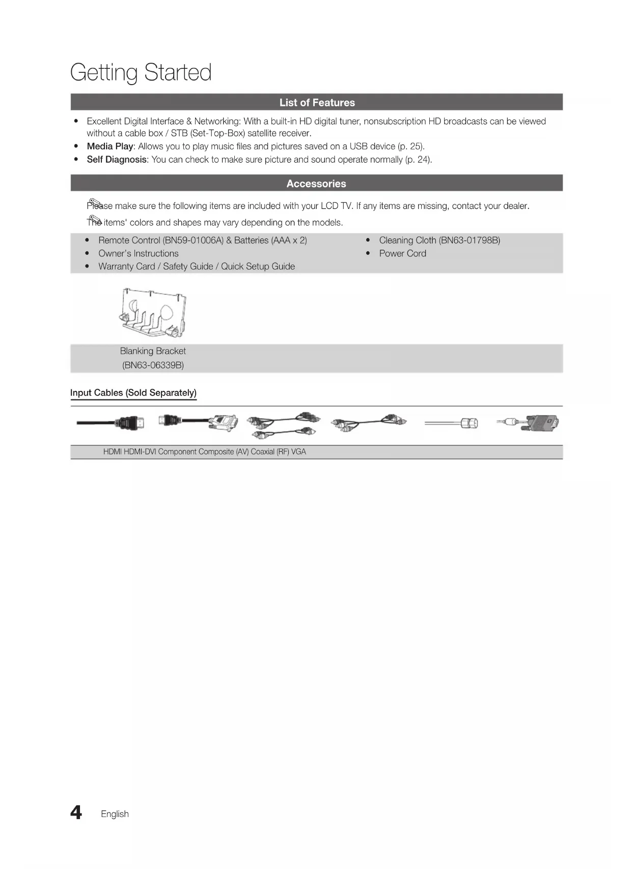 When using an HDMI/DVI cable connection, you must use the HDMI (DVI) IN jack for video. A DVD, Blu-ray player, HD cable box, or HD STB satellite receiver may require a DVI-HDMI (DVI to HDMI) cable or DVI-HDMI (DVI to HDMI) adapter. The DVI AUDIO IN jack is required for audio. x The picture may not display normally (if at all) or the audio may not work if an external device that uses an older version of HDMI mode is connected to the TV. If such a problem occurs, ask the manufacturer of the external device about the HDMI version and, if out of date, request an upgrade. x Be sure to purchase a certified HDMI cable. Otherwise, the picture may not display or a connection error may occur.HDMI OUTDVI OUT R-AUDIO-L AUDIO OUT WR Device DeviceRed WhiteHDMI Cable (Not Supplied)HDMI to DVI Cable (Not Supplied)Audio Cable (Not Supplied) [LC500-NA]BN68-03219A-01L03.indb 9 2010-09-27 오전 10:49:3510