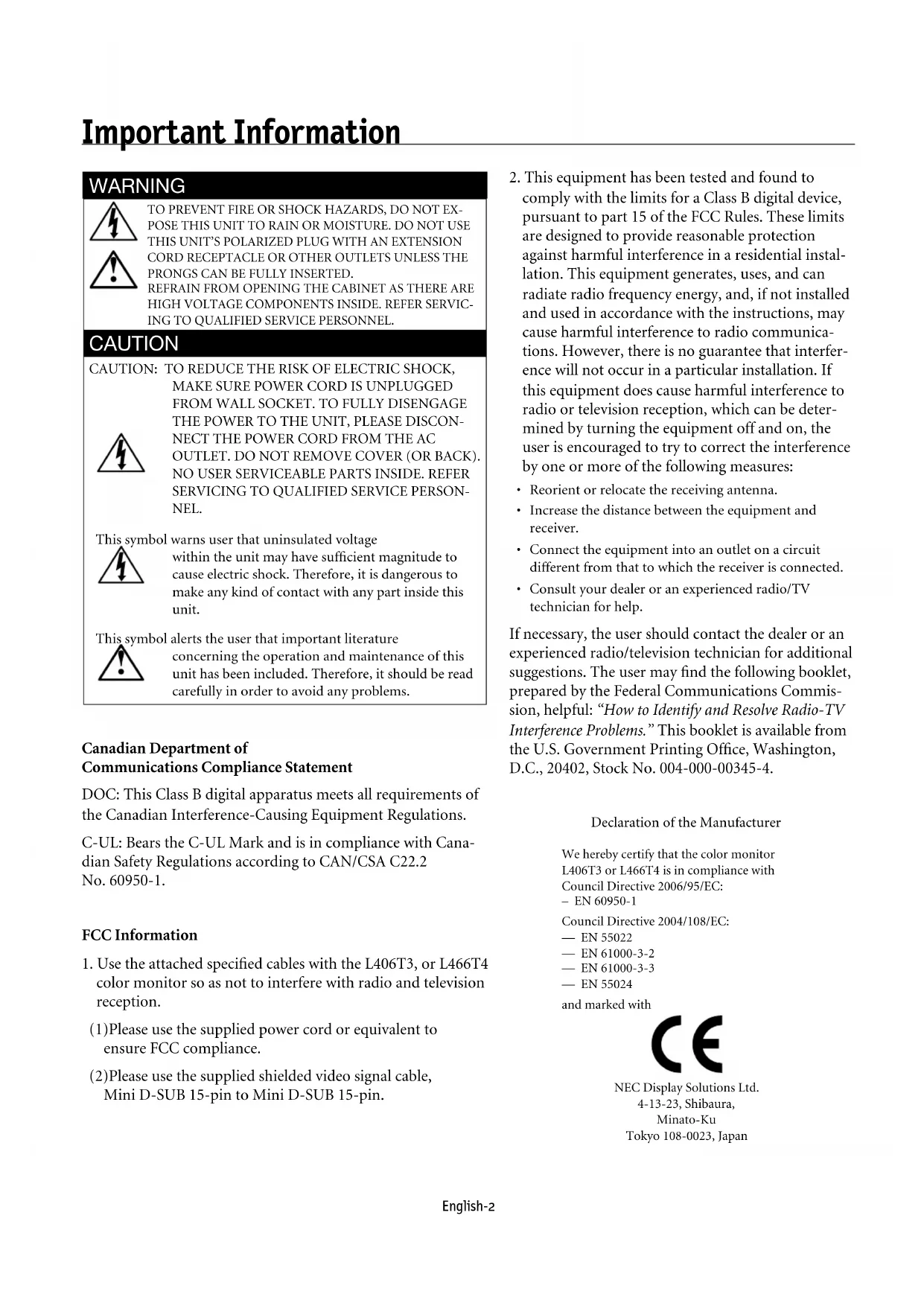 color monitor so as not to interfere with radio and television reception. (1)Please use the supplied power cord or equivalent to ensure FCC compliance. (2)Please use the supplied shielded video signal cable, Mini D-SUB 15-pin to Mini D-SUB 15-pin. Declaration of the Manufacturer We hereby certify that the color monitor L406T3 or L466T4 is in compliance with Council Directive 2006/95/EC: – EN 60950-1 Council Directive 2004/108/EC: — EN 55022 — EN 61000-3-2 — EN 61000-3-3 — EN 55024 and marked with NEC Display Solutions Ltd. 4-13-23, Shibaura, Minato-Ku Tokyo 108-0023, JapanEnglish English-3 Safety Precautions and Maintenance