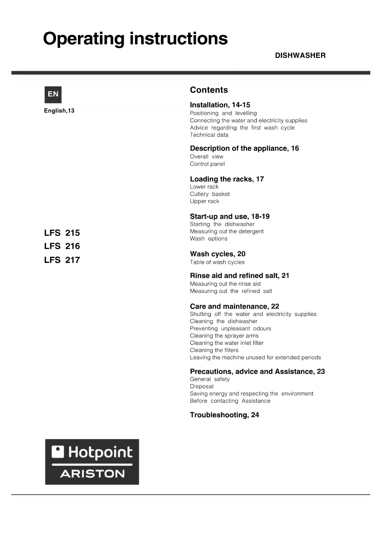 Download the instructions for your Dishwasher in PDF format for free! Find your manual LFS 217 A BKHA - HOTPOINT ARISTON and take your electronic device back in hand. On this page are published all the documents necessary for the use of your device. LFS 217 A BKHA by HOTPOINT ARISTON.