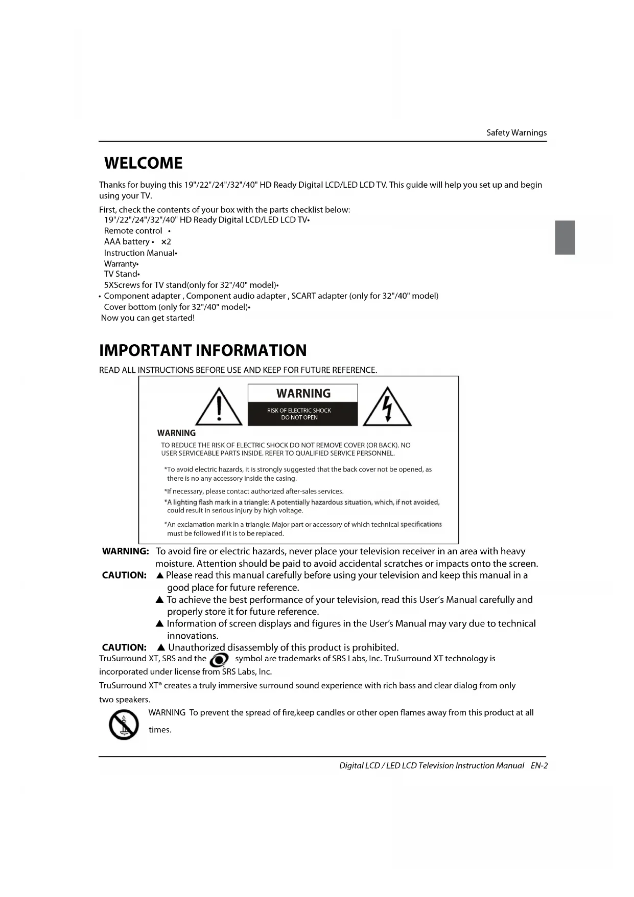 WELCOME Thanks for buying this 19"/22"/24"/32"/40" HD Ready Digital LCD/LED LCD TV. This guide will help you set up and begin