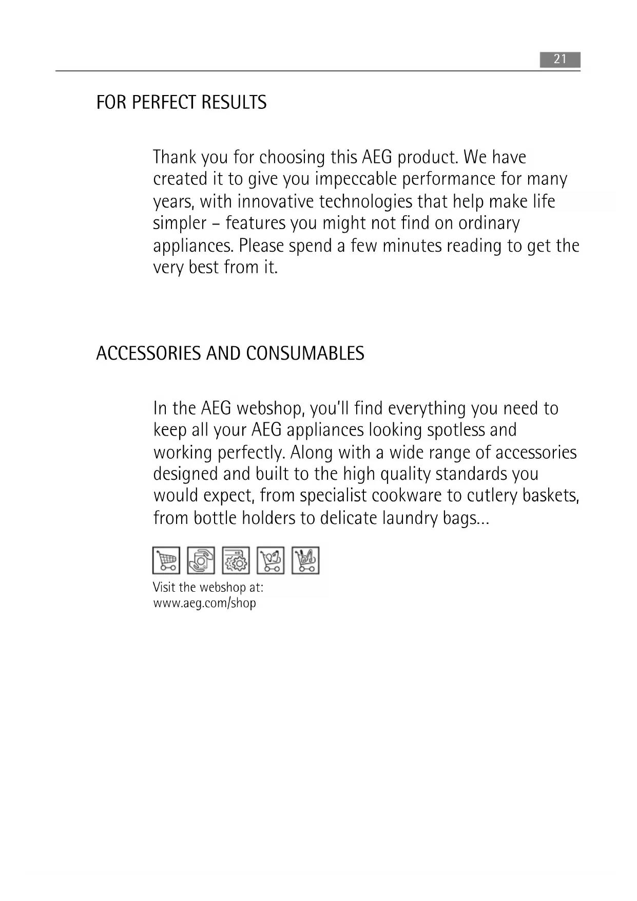 In the AEG webshop, you’ll find everything you need to keep all your AEG appliances looking spotless and working perfectly. Along with a wide range of accessories designed and built to the high quality standards you would expect, from specialist cookware to cutlery baskets, from bottle holders to delicate laundry bags… Visit the webshop at: www.aeg.com/shop 21CONTENTS 23 Safety information 25 Operation 26 Daily use 27 First use 27 Helpful hints and tips 27 Care and Cleaning 29 What to do if… 31 Technical data 31 Installation 37 Noises 39 Environmental concerns The following symbols are used in this user manual: Important information concerning your personal safety and information on how to avoid damaging the appliance. General information and tips Environmental information Subject to change without notice 22 ContentsSAFETY INFORMATION In the interest of your safety and to ensure the correct use, before installing and first using the appliance, read this user manual carefully, including its hints and warnings. To avoid unnecessary mistakes and accidents, it is important to ensure that all people using the ap- pliance are thoroughly familiar with its operation and safety features. Save these instruc- tions and make sure that they remain with the appliance if it is moved or sold, so that ev- eryone using it through its life will be properly informed on appliance use and safety. For the safety of life and property keep the precautions of these user's instructions as the manufacturer is not responsible for damages caused by omission. Children and vulnerable people safety