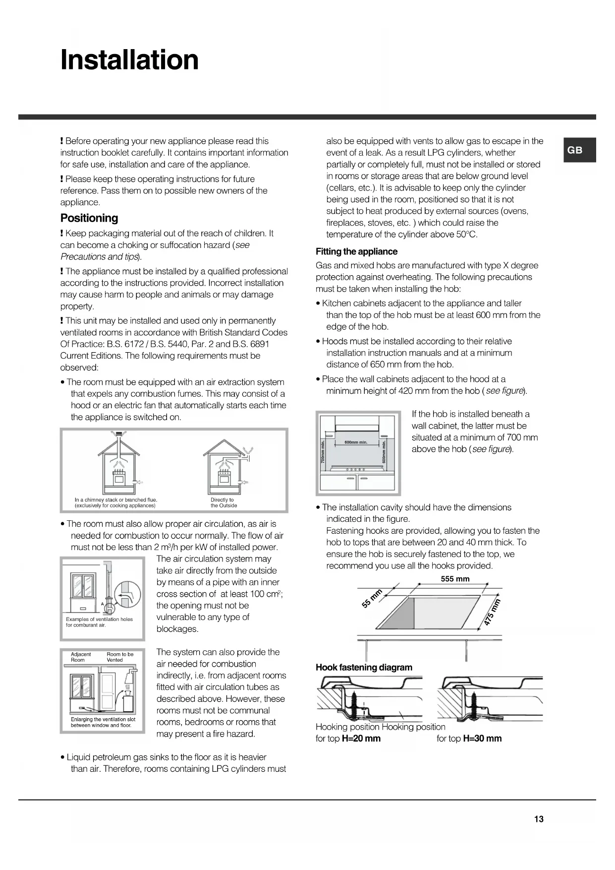 - The installation cavity should have the dimensions indicated in the figure. Fastening hooks are provided, allowing you to fasten the hob to tops that are between 20 and 40 mm thick. To ensure the hob is securely fastened to the top, we recommend you use all the hooks provided. 555 mm55 mm475 mm Hook fastening diagram Hooking position Hooking position for top H=20 mm for top H=30 mm Installation Enlarging the ventilation slot between window and floor. Adjacent Room Room to be Vented