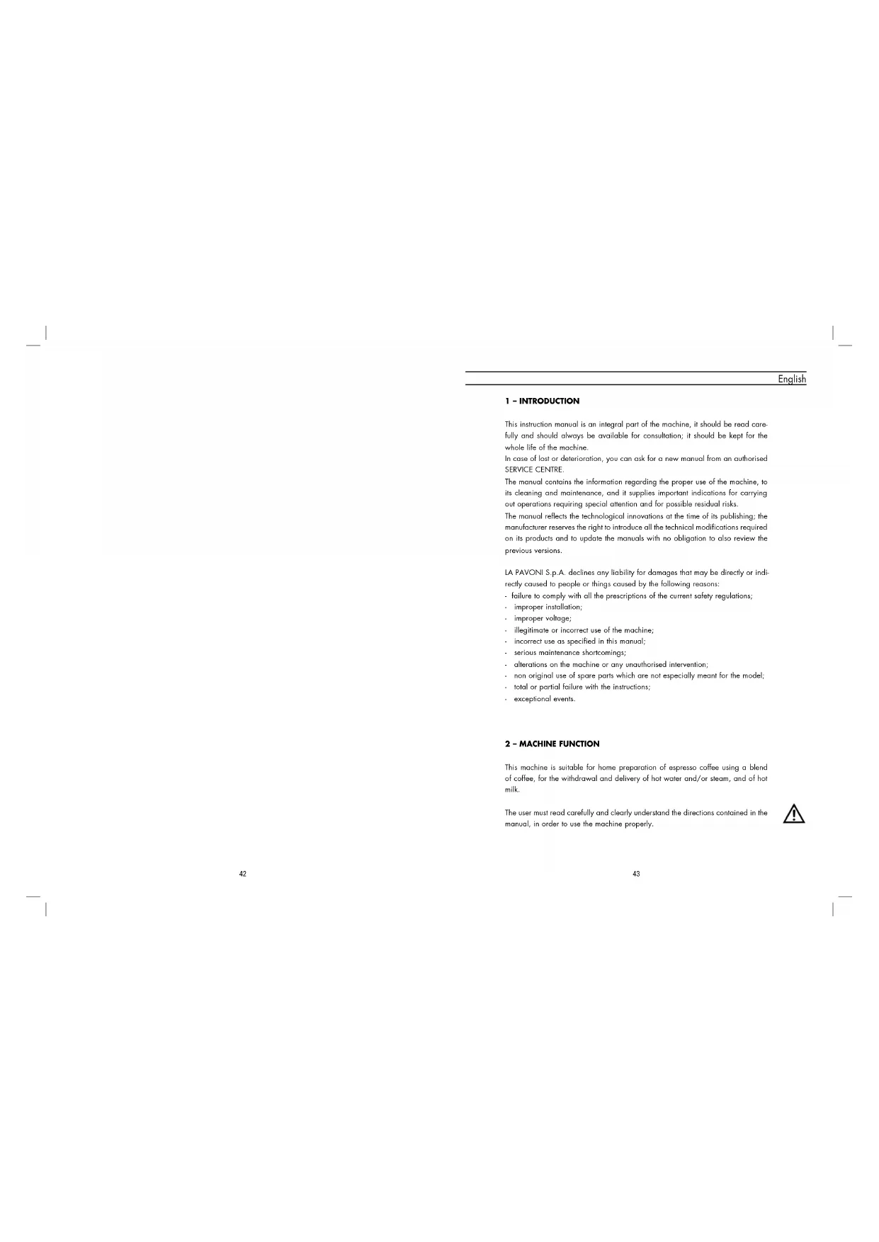 ANOMALIES (TROUBLESHOOTING) 64 GB1 – INTRODUCTION This instruction manual is an integral part of the machine, it should be read care- fully and should always be available for consultation; it should be kept for the whole life of the machine. In case of lost or deterioration, you can ask for a new manual from an authorised SERVICE CENTRE. The manual contains the information regarding the proper use of the machine, to its cleaning and maintenance, and it supplies important indications for carrying out operations requiring special attention and for possible residual risks. The manual reflects the technological innovations at the time of its publishing; the manufacturer reserves the right to introduce all the technical modifications required on its products and to update the manuals with no obligation to also review the previous versions. LA PAVONI S.p.A. declines any liability for damages that may be directly or indi- rectly caused to people or things caused by the following reasons: - failure to comply with all the prescriptions of the current safety regulations; - improper installation; - improper voltage; - illegitimate or incorrect use of the machine; - incorrect use as specified in this manual; - serious maintenance shortcomings; - alterations on the machine or any unauthorised intervention; - non original use of spare parts which are not especially meant for the model; - total or partial failure with the instructions; - exceptional events. 2 – MACHINE FUNCTION This machine is suitable for home preparation of espresso coffee using a blend of coffee, for the withdrawal and delivery of hot water and/or steam, and of hot milk. The user must read carefully and clearly understand the directions contained in the manual, in order to use the machine properly.
