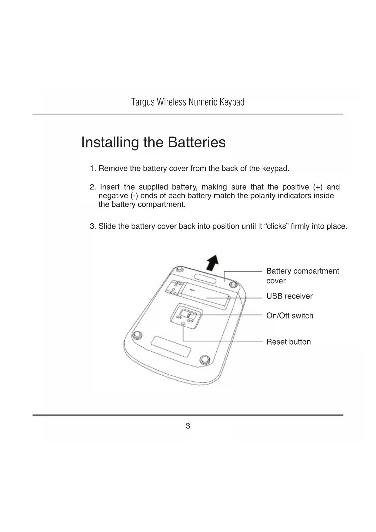 3. Slide the battery cover back into position until it “clicks” firmly into place.Targus Wireless Numeric Keypad
