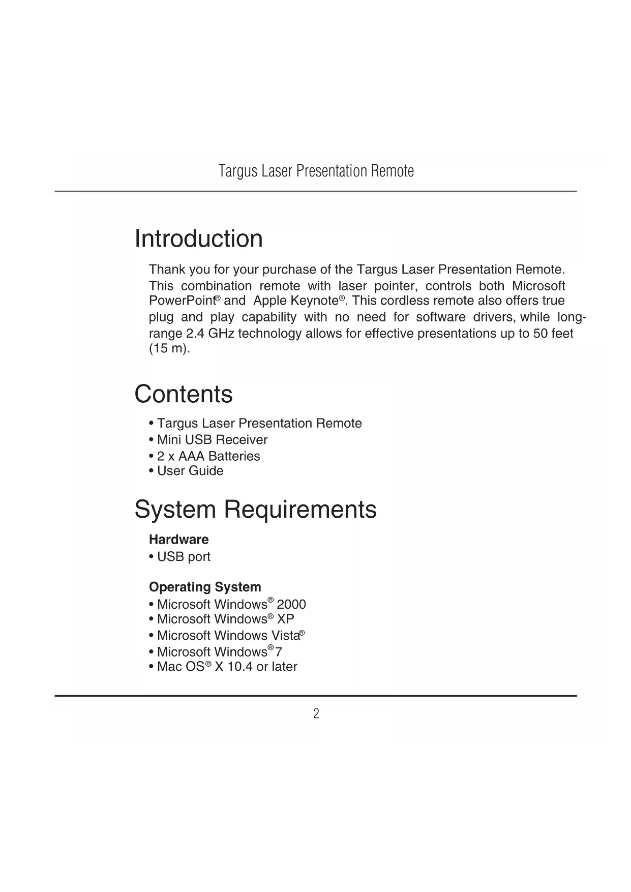 - Consult the dealer or an experienced radio/TV technician for help. Changes or modifications not authorized by the party responsible for compliance could void the user’s authority to operate this product. Microsoft, Windows, and Windows Vista are either registered trademarks or trademarks of Microsoft Corporation in the United States and/or other countries. All trademarks and registered trademarks are the properties of their respective owners. All rights reserved.Targus Laser Presentation Remote