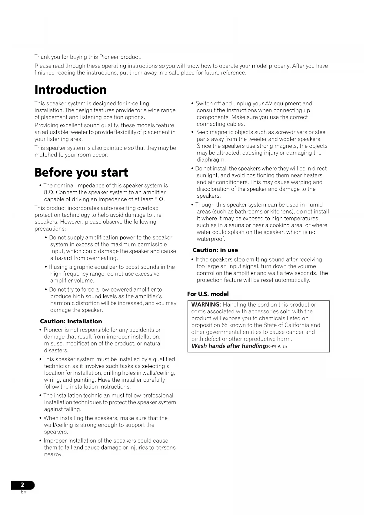 En Thank you for buying this Pioneer product. Please read through these operating instructions so you will know how to operate your model properly. After you have finished reading the instructions, put them away in a safe place for future reference. Introduction This speaker system is designed for in-ceiling installation. The design features provide for a wide range of placement and listening position options.Providing excellent sound quality, these models feature an adjustable tweeter to provide flexibility of placement in your listening area.This speaker system is also paintable so that they may be matched to your room decor. Before you start • The nominal impedance of this speaker system is 8 Ω. Connect the speaker system to an amplifier capable of driving an impedance of at least 8 Ω.This product incorporates auto-resetting overload protection technology to help avoid damage to the speakers. However, please observe the following precautions:• Do not supply amplification power to the speaker system in excess of the maximum permissible input, which could damage the speaker and cause a hazard from overheating.• If using a graphic equalizer to boost sounds in the high-frequency range, do not use excessive amplifier volume.• Do not try to force a low-powered amplifier to produce high sound levels as the amplifier’s harmonic distortion will be increased, and you may damage the speaker.Caution: installation• Pioneer is not responsible for any accidents or damage that result from improper installation, misuse, modification of the product, or natural disasters.• This speaker system must be installed by a qualified technician as it involves such tasks as selecting a location for installation, drilling holes in walls/ceiling, wiring, and painting. Have the installer carefully follow the installation instructions.• The installation technician must follow professional installation techniques to protect the speaker system against falling.• When installing the speakers, make sure that the wall/ceiling is strong enough to support the speakers.• Improper installation of the speakers could cause them to fall and cause damage or injuries to persons nearby.• Switch off and unplug your AV equipment and consult the instructions when connecting up components. Make sure you use the correct connecting cables.• Keep magnetic objects such as screwdrivers or steel parts away from the tweeter and woofer speakers. Since the speakers use strong magnets, the objects may be attracted, causing injury or damaging the diaphragm.• Do not install the speakers where they will be in direct sunlight, and avoid positioning them near heaters and air conditioners. This may cause warping and discoloration of the speaker and damage to the speakers.• Though this speaker system can be used in humid areas (such as bathrooms or kitchens), do not install it where it may be exposed to high temperatures, such as in a sauna or near a cooking area, or where water could splash on the speaker, which is not waterproof.Caution: in use• If the speakers stop emitting sound after receiving too large an input signal, turn down the volume control on the amplifier and wait a few seconds. The protection feature will be reset automatically. For U.S. model