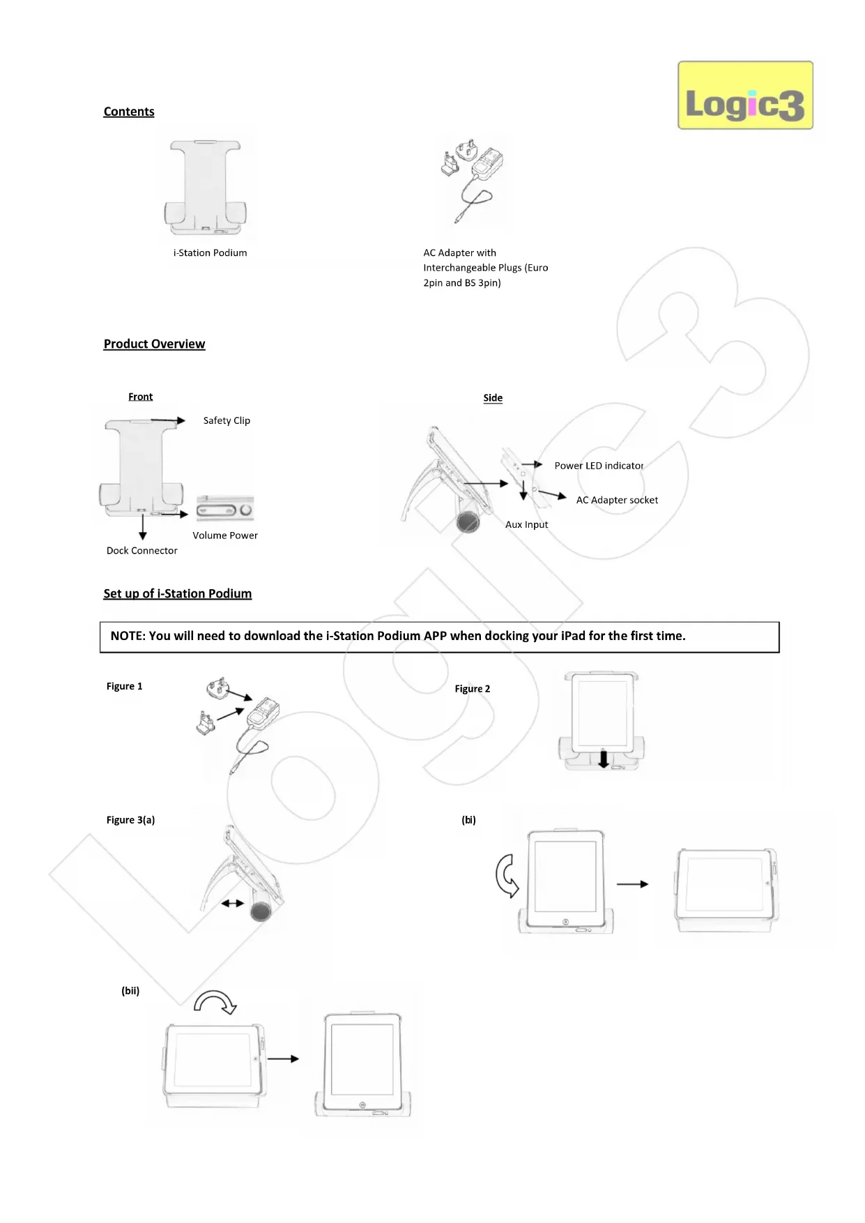 Once the unit is switched ON, press the Power button which will toggle the source between iPad and Aux –In mode. LED Power Status iPad Mode – Power LED (Permantly ON) Aux-In Mode – Power LED (Flashing) Logic3APP The APP control has numerous features including Time/Date/Weather/Internet Radio – see separate manual Recharging the iPad To recharge your iPad, please ensure that the i-Station is connected to the AC Adaptor. The iPad will recharge automatically when docked onto the i-Station. Trouble Shooting Spare Part List Part No. Item code Item Name Price 1 YAD028 AC Adapter (Interchangeable Plugs) For prices visit our website at www.logic3.com 2 YCB000K Line in Cable (Black) Please use Item Codes above, when searching for Spare Parts on our Website www.logic3.com Problem What Should I do? No Sound Check play status on the iPad Please try updating the software for your iPad using the latest iTunes. Ensure that the correct source is selected (iPad/Aux –In) – See ‘Select iPad/Aux In mode’ section in manual. Should you have any setup problems with the i-Station Podium (MPS028K) please contact our Technical Support Hotline on +44 (01923) 471 000 – National/International call rates apply or Email support@logic3.com - Spare parts are available for some models at our website www.logic3.com Logic3Logic3Clip de séc urité Connecteur Dock Volume Alimentation Alimentation CA Figure 1 Figure 2 Figure 3(a)